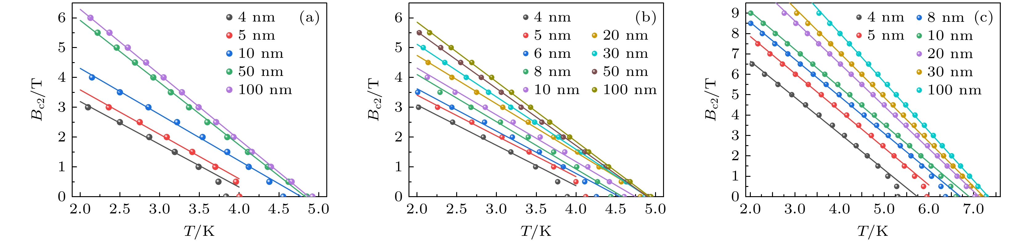 图 3 不同厚度WGe (a), WSi (b)和MoGe (c)薄膜临界磁场的温度依赖曲线(通过对温度依赖曲线的线性拟合, 提取出绝对零度上临界磁场Bc2(0))