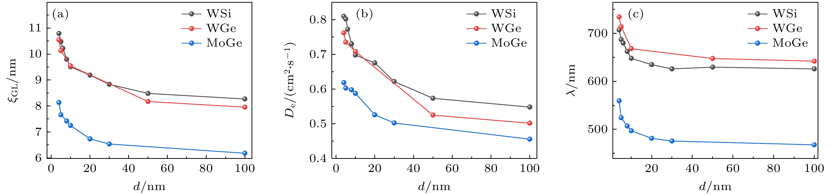 样品 d/nm Rsn/Ω Tc/K ξ(0)/nm De/(cm2·s–1) Δ(0)/meV λ(0)/nm WSi 4 444.65 3.90 10.79 0.81 0.59 707 5 354.90 4.12 10.48 0.80 0.63 687 6 298.85 4.26 10.22 0.77 0.65 680 8 221.84 4.44 9.80 0.73 0.67 662 10 176.25 4.61 9.51 0.70 0.70 648 20 88.31 4.81 9.19 0.68 0.73 635 30 57.95 4.87 8.83 0.62 0.74 626 50 35.47 4.91 8.48 0.57 0.75 630 100 17.65 4.94 8.27 0.55 0.75 626 表 3 不同厚度MoGe薄膜材料的超导物性参数