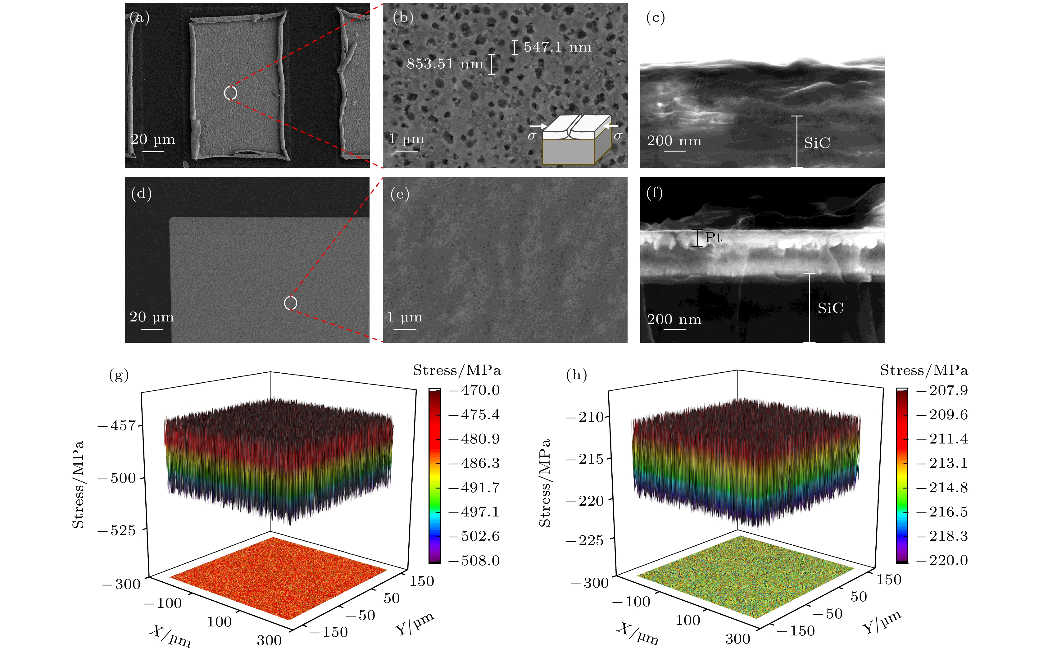 图 5 SiC/Ti/TaSi2/Pt 600 ℃老化20 h后形貌 (a), (b)表面形貌; (c)SEM截面. SiC/Ti/TaSi2退火后沉积Pt 600 ℃老化20 h后形貌 (d), (e)表面形貌; (f)SEM截面. (g) SiC/Ti/TaSi2/Pt 600 ℃老化20 h后电极应力分布; (f) SiC/Ti/TaSi2退火后沉积Pt 600 ℃老化20 h后电极应力分布