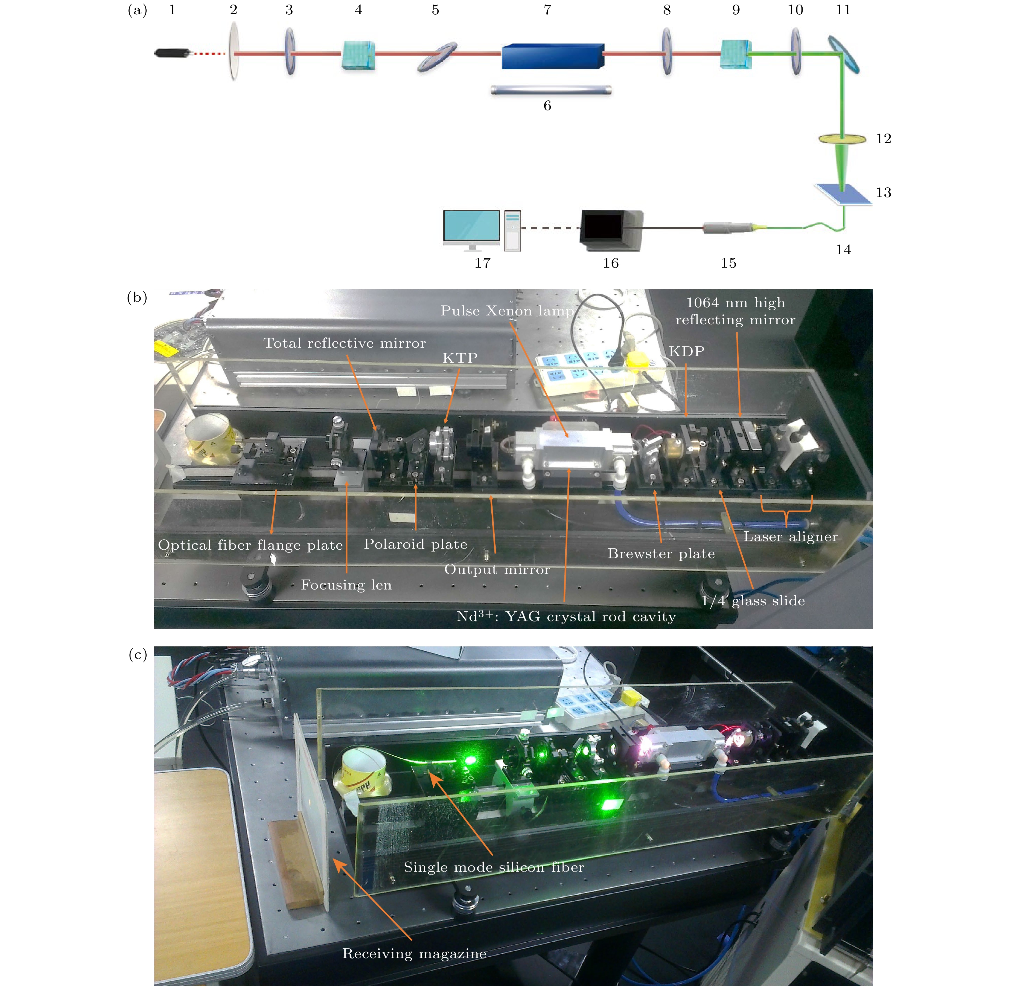 图 1 高峰值功率Nd3+: YAG脉冲激光器泵浦单模光纤产生非线性效应实验装置 (a) 实验装置原理图, 其中1为激光对准器, 2为1064 nm高反射镜, 3为1/4载玻片, 4为磷酸二氢钾晶体(KDP), 5为布儒斯特板, 6为脉冲氙灯, 7为Nd3+: YAG晶体棒腔, 8为输出镜, 9为磷酸氧钛钾晶体(KTP), 10为偏振片, 11为全反射镜, 12为聚焦透镜, 13为光纤法兰盘, 14为单模硅光纤, 15为接收仓, 16为光谱仪, 17为计算机; (b) 装置启动前; (c) 装置启动后