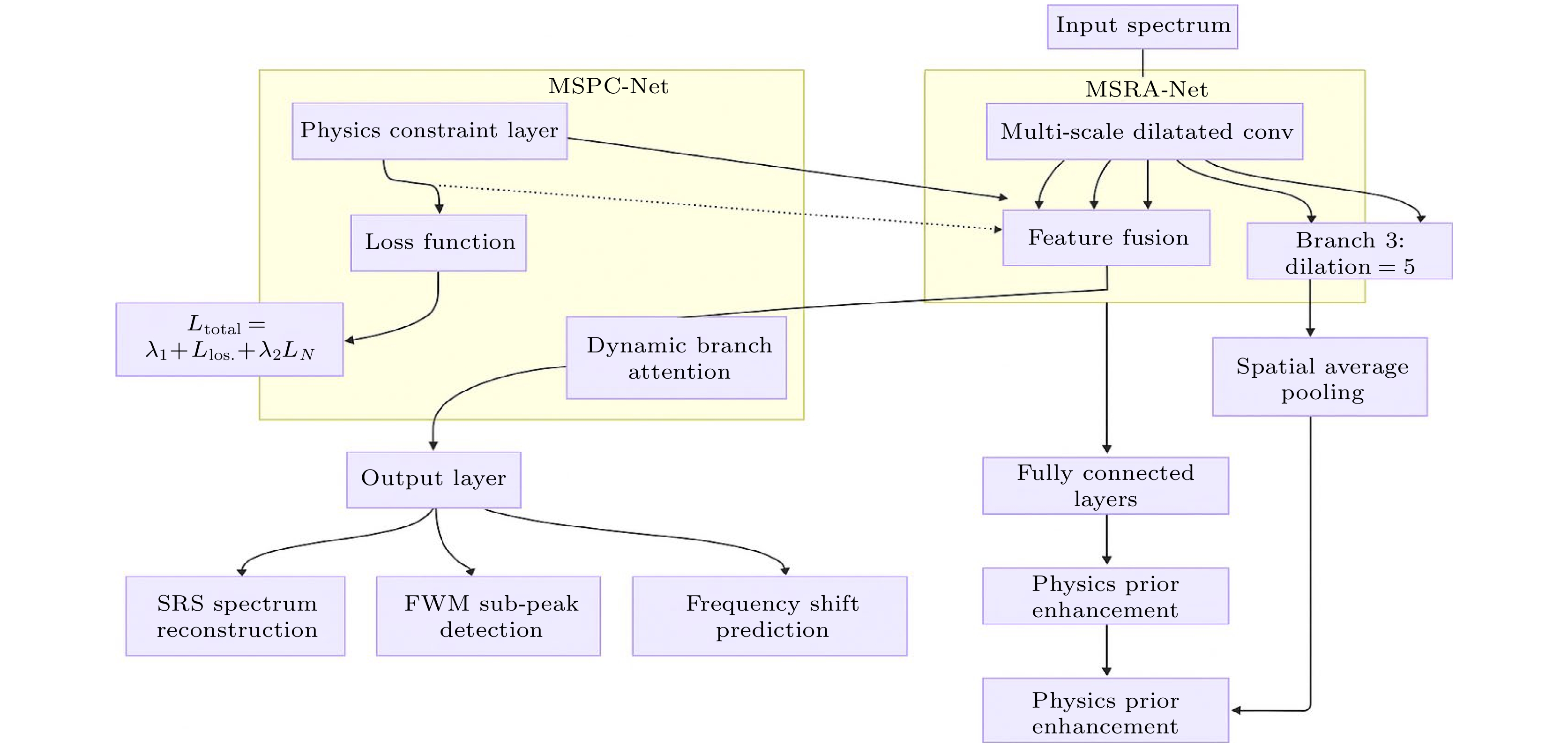 In view of the difficulty in analyzing the strong nonlinear coupling effect between four-wave mixing and stimulated Raman scattering in single-mode optical fibers, this paper introduces a novel multi-scale physically constrained network (MSPC-Net), which effectively integrates fundamental physical mechanisms with advanced neural network techniques. The proposed model incorporates the frequency domain residual derived from the nonlinear Schrödinger equation directly into the network optimization procedure as a differentiable physical constraint term. This strategic inclusiveness ensures that the learning process is consistent with the fundamental physical principles governing light propagation in optical fibers. Furthermore, the model architecture adopts a multi-scale dilated convolution module specifically designed to capture and fuse features across different granularities, including fine local spectral details, intermediate-range broadening effects, and long-range attenuation trends. This multi-scale approach can realize the simultaneous and high-precision inversion of both separated spectral components and critical physical parameters. Experimental evaluations are conducted using single-mode quartz fibers with lengths of 250 meters and 500 meters, respectively. The results demonstrate that the Stokes spectra reconstructed by MSPC-Net achieve remarkably low root mean square errors, only 0.014 and 0.0173 for the two fiber lengths respectively. This performance represents a reduction of more than 68% compared with that of traditional convolutional neural networks. Additionally, the average absolute errors of frequency offset prediction are as low as 0.03 nmr and 0.04 nm, with an accuracy improvement of approximately 90% compared with those of existing state-of-the-art methods. Under noisy conditions with a signal-to-noise ratio of 6 dB, the model maintains an exceptional detection accuracy of up to 95.3% for identifying four wave mixing (FWM) sub-peak information, while keeping the pseudo-peak rate below 4.7%. Owing to the embedded physical constraints and lightweight structural design, the proposed model shows just a 9.8% increase in root mean square error even under challenging noise conditions with a signal-to-noise ratio of 15 dB. Moreover, MSPC-Net demonstrates satisfactory real-time processing capabilities, making it suitable for deployment on embedded devices. This practical efficiency makes the model a promising solution for optimizing high-power optical communication systems and advancing distributed optical fiber sensing applications. By successfully combining strict physical laws with multi-scale feature extraction, this research presents an effective approach to resolving the analytical difficulties associated with complex nonlinear effects in long-distance optical fibers, while significantly improving both the theoretical consistency and noise robustness of the prediction outcomes. -