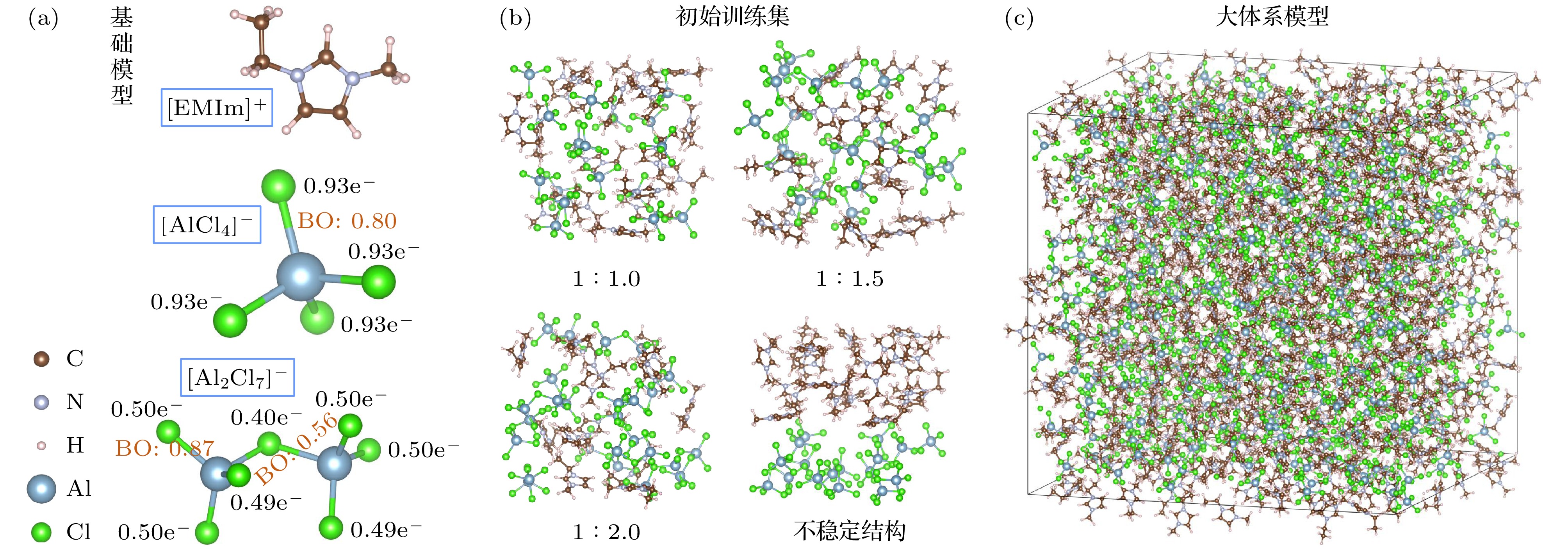 图 1 [EMIm]+Cl–+AlCl3离子液体分子结构模型 (a) 阴阳离子单元分子结构, 其中给出了Al—Cl键键级及每个氯离子所带电荷; (b) 训练集模型; (c) 性质计算采用的分子动力学模型