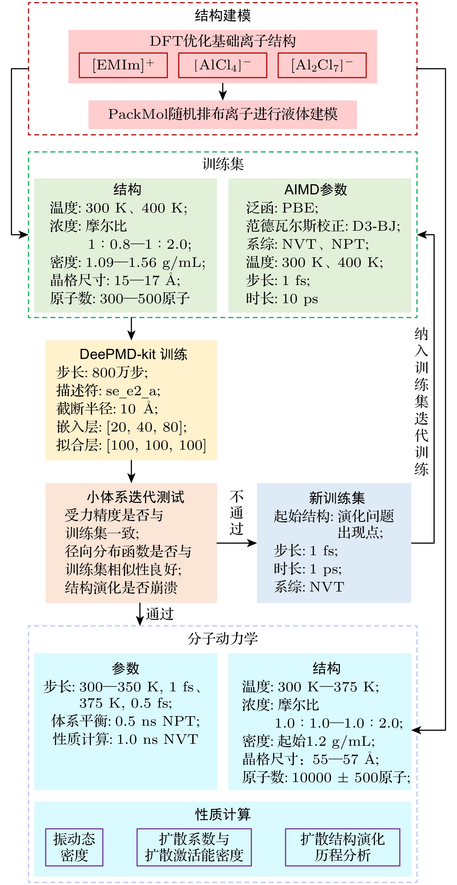 摩尔比 原子数 [AlCl4]–/个 [Al2Cl7]–/个 [EMIm]–/个 温度/K 密度/(g·mL–1) 系综 1.0 408 17 0 17 400 1.09 NPT 300 1.09 NPT 300 1.28 NVT 300 1.44 NVT 1.3 376 11 4 15 400 1.21 NPT 300 1.21 NPT 300 1.34 NVT 300 1.52 NVT 1.5 364 7 7 14 400 1.17 NPT 300 1.17 NPT 300 1.36 NVT 300 1.52 NVT 1.7 376 4 10 14 400 1.27 NPT 300 1.27 NPT 300 1.38 NVT 300 1.55 NVT 2.0 364 0 13 13 400 1.30 NPT 300 1.30 NPT 300 1.41 NVT 300 1.56 NVT 表 2 基于机器学习势的分子动力学模拟体系结构设置及参数