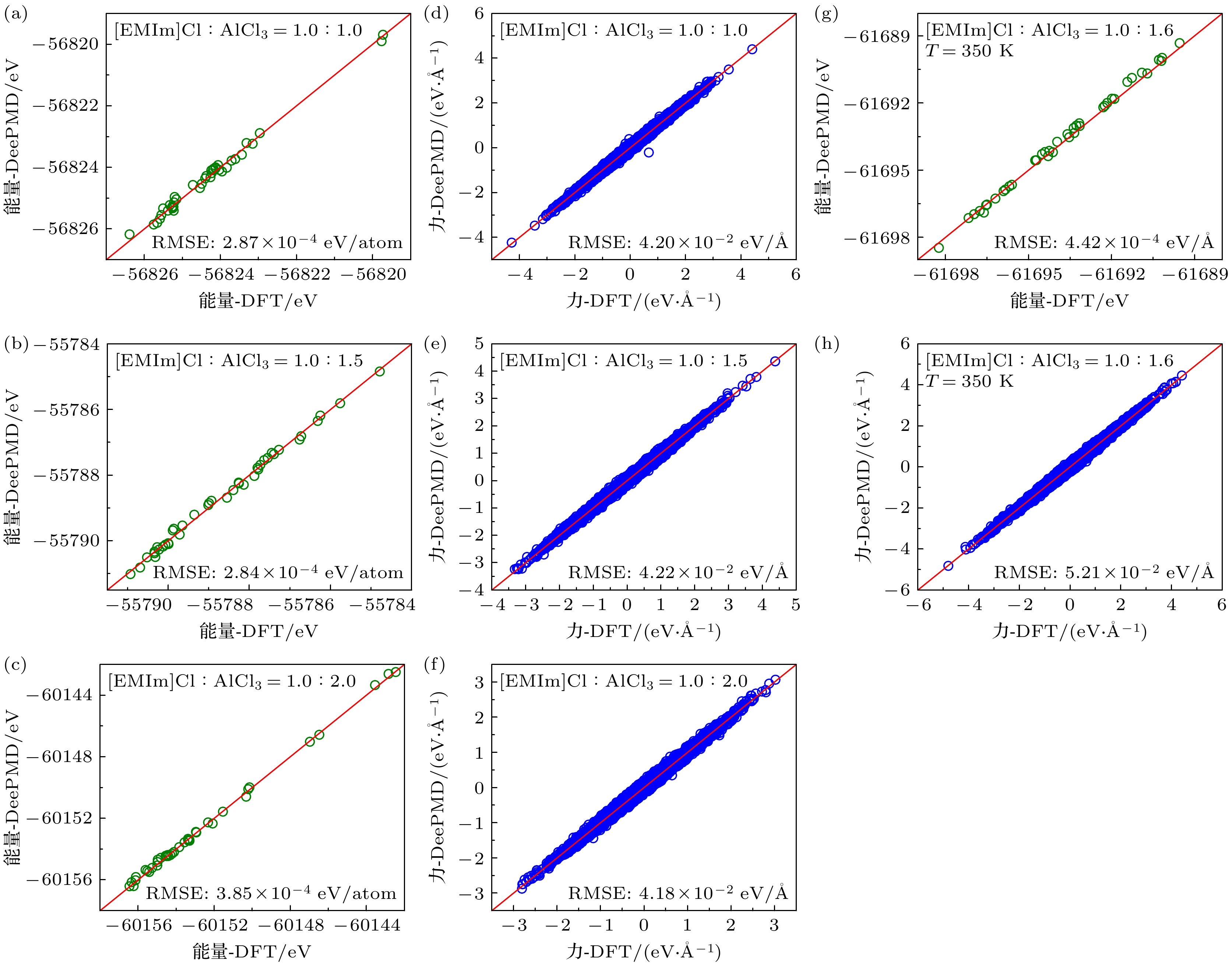 图 3 不同[EMIm]+Cl–∶AlCl3比例时, 机器学习势对能量与力精度RMSE的测试结果, 总能量 (a) 1∶1.0; (b) 1∶1.5; (c) 1∶2.0; (g) 1∶1.6, T = 350 K; 原子受力 (d) 1∶1.0; (e) 1∶1.5; (f) 1∶2.0; (h) 1∶1.6, T = 350 K