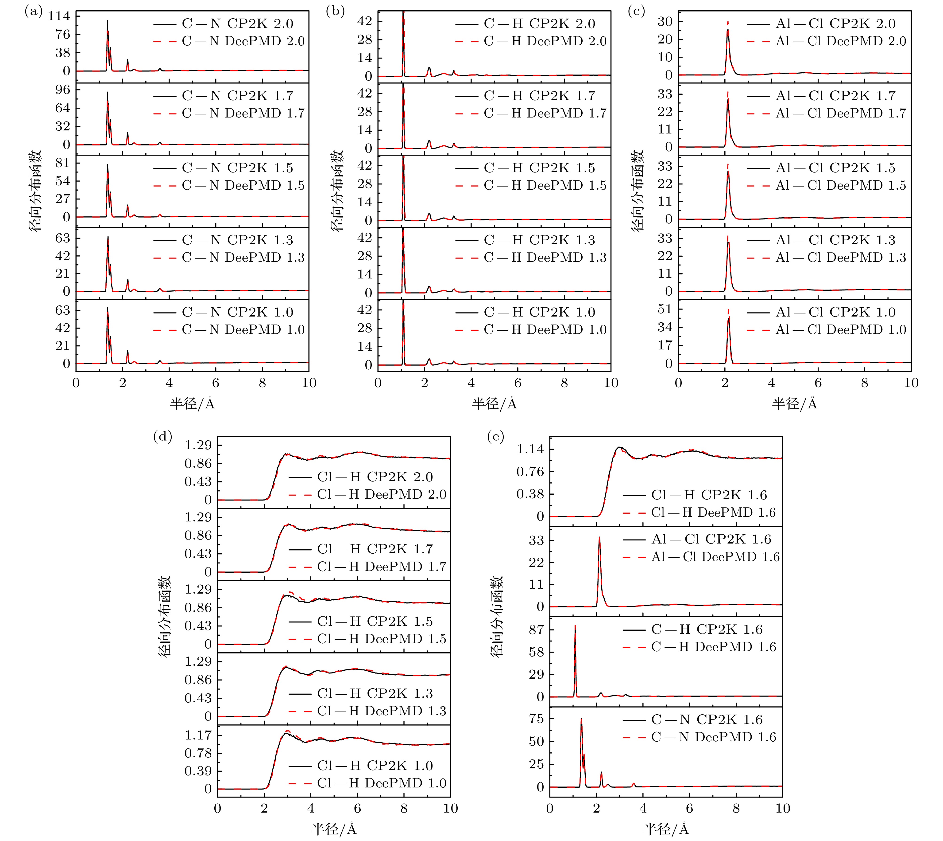 图 4 CP2K及DeePMD分子动力学模拟的在不同的 [EMIm]+Cl–∶AlCl3 = 1∶x (x取值范围为1.0—2.0)比例下代表性原子对的径向分布函数对比 (a) C—N; (b) C—H; (c) Al—Cl; (d) Cl—H; (e)机器学习势预测x = 1.6时的RDF与CP2K计算结果的对比