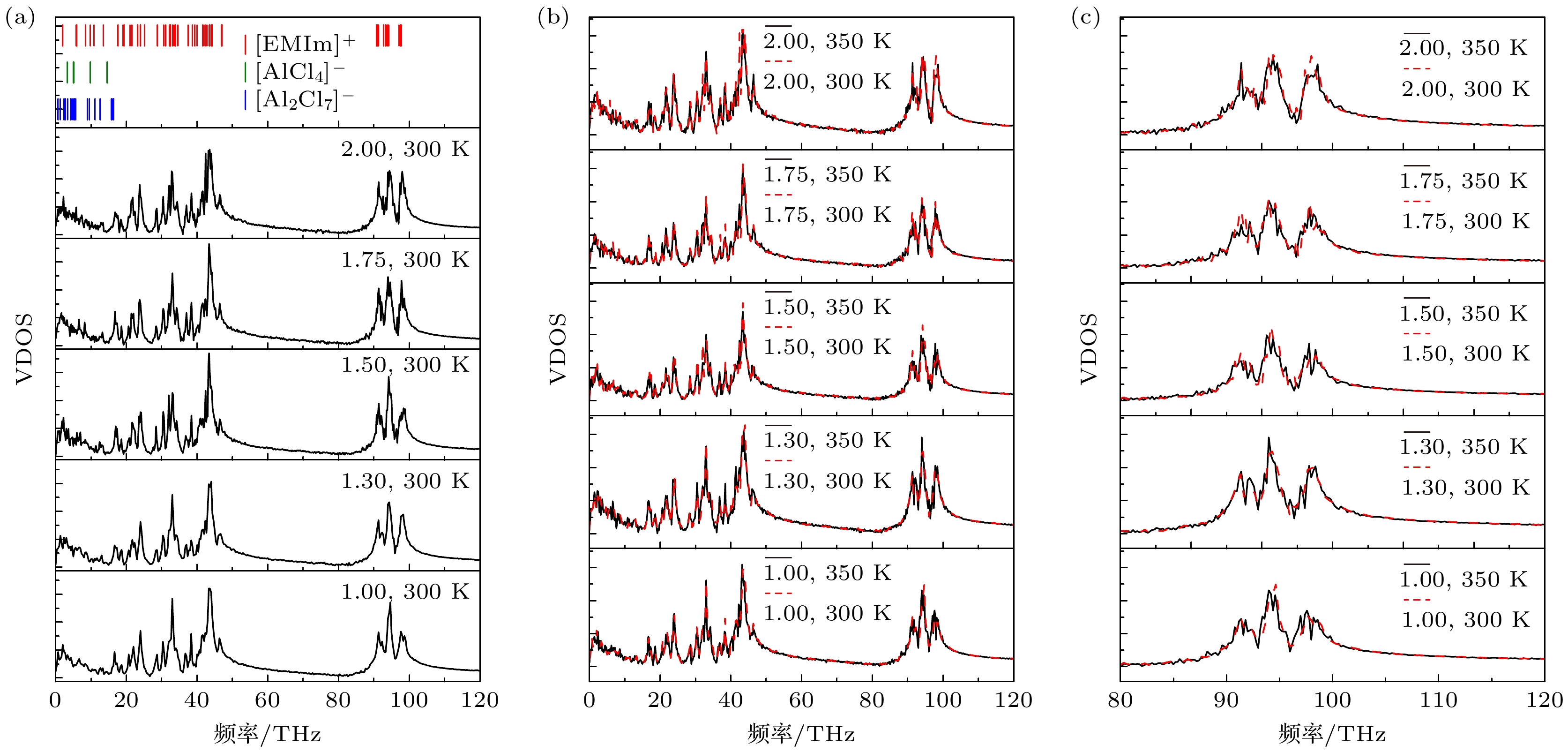 Figure 5. VDOS profiles obtained from DP-MD simulations versus vibrational frequencies of the isolated cation and anions in [EMIm]+Cl–+AlCl3 ion-liquid at 1∶1 to 1∶2 molar ratios: (a) VDOS at 300 K; (b) comparison of VDOS profiles at 300 K and 350 K; (c) comparison of VDOS at 300 K and 350 K above 80 THz.