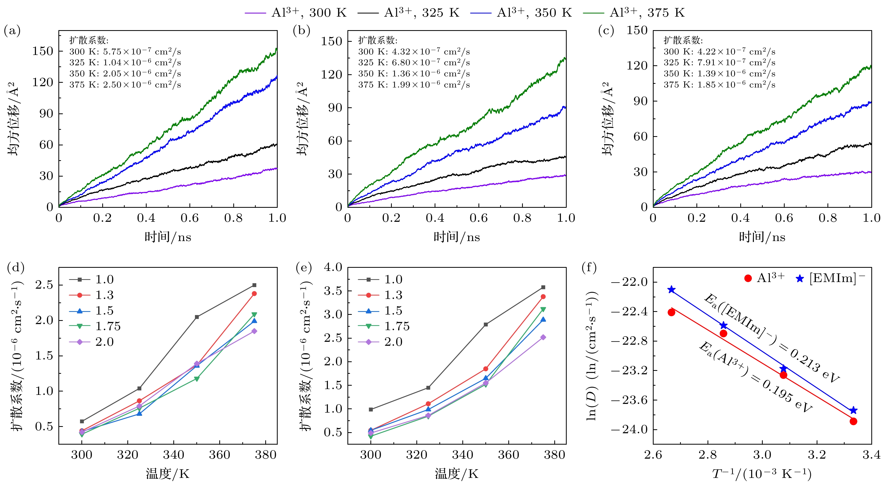 Figure 6. The diffusion properties of [EMIm]+Cl–+AlCl3 ionic liquids from DP-MD simulations at various temperatures and molar ratios: (a) MSD for the molar ratio of 1.0∶1.0; (b) MSD for the molar ratio of 1.0∶1.5; (c) MSD for the molar ratio of 1.0∶2.0; (d) diffusion coefficients of Al3+; (e) diffusion coefficients of [EMIm]+; (f) diffusion activation energy of Al3+ and [EMIm]+.