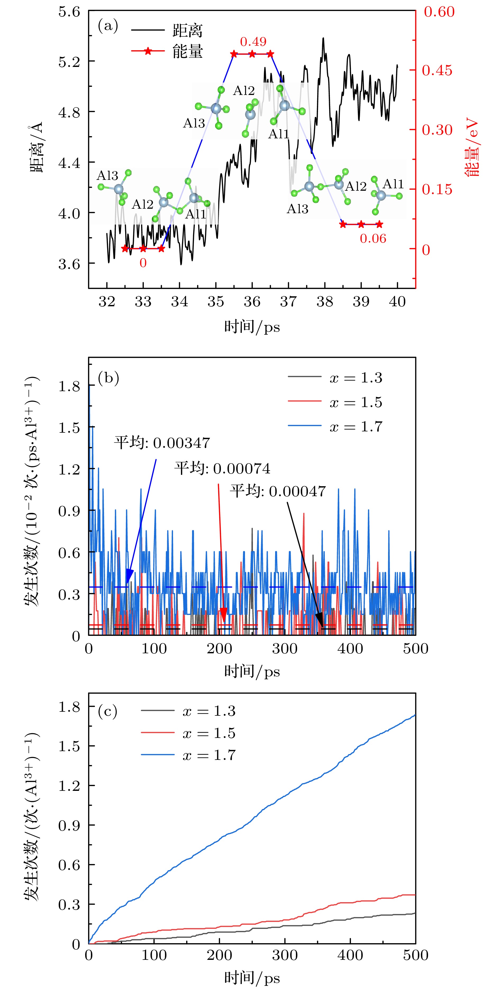 图 9 (a) AlCl3通过[Al2Cl7]–+AlCl3转换反应传递扩散过程及对应转换反应能垒; (b), (c) [AlCl4]–与[Al2Cl7]–互相转化反应的瞬态频率(每ps反应发生次数)及累计频率情况(反应发生次数累计)