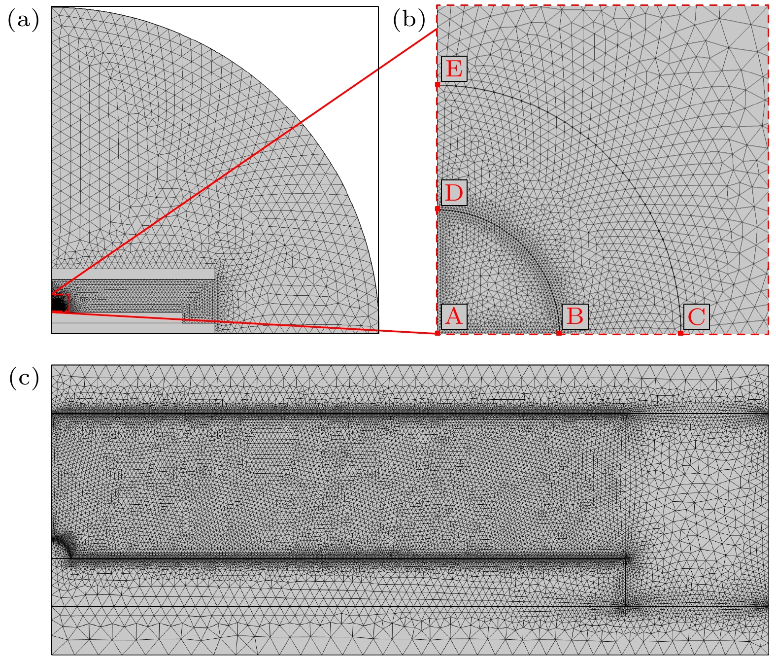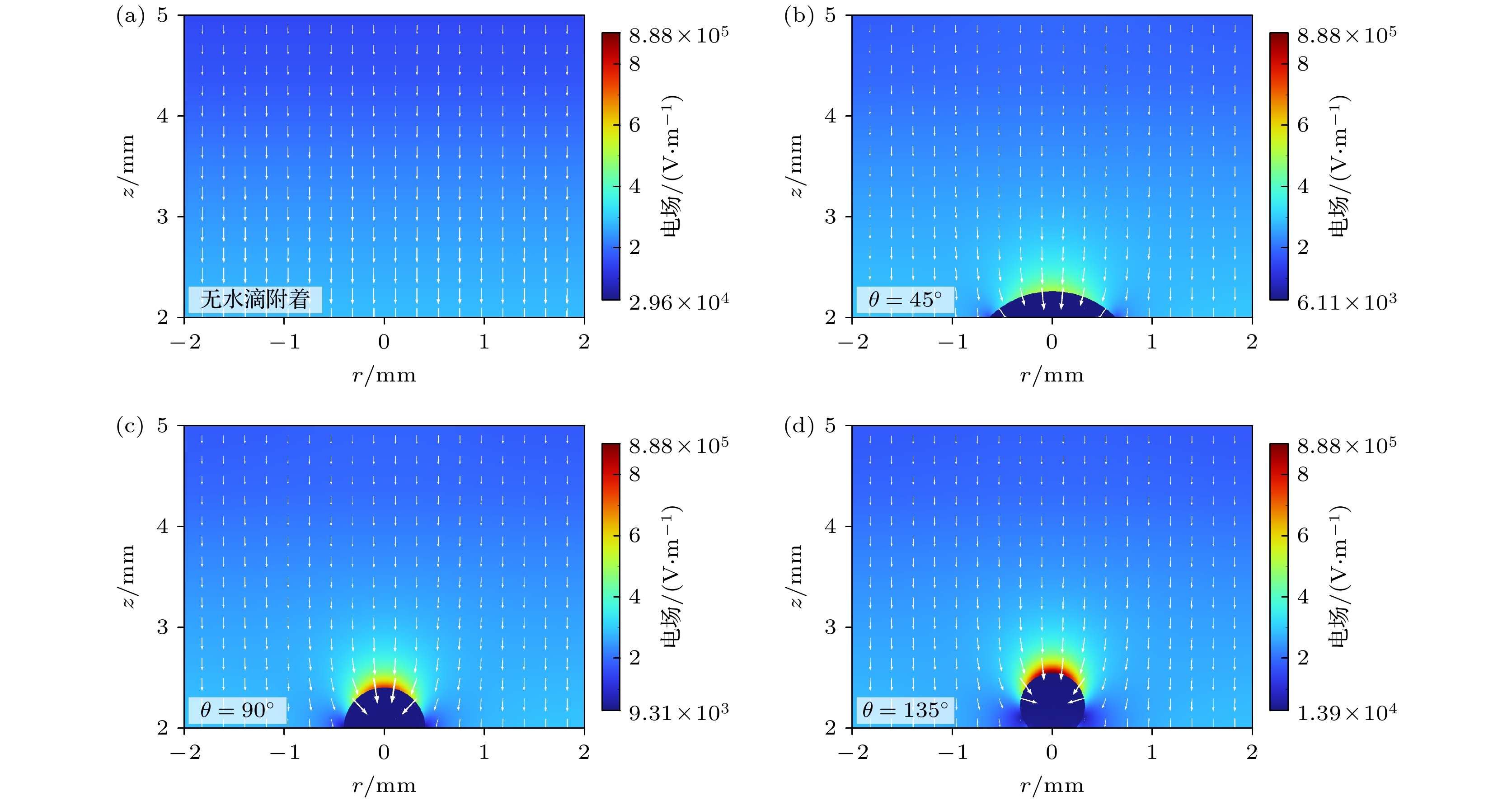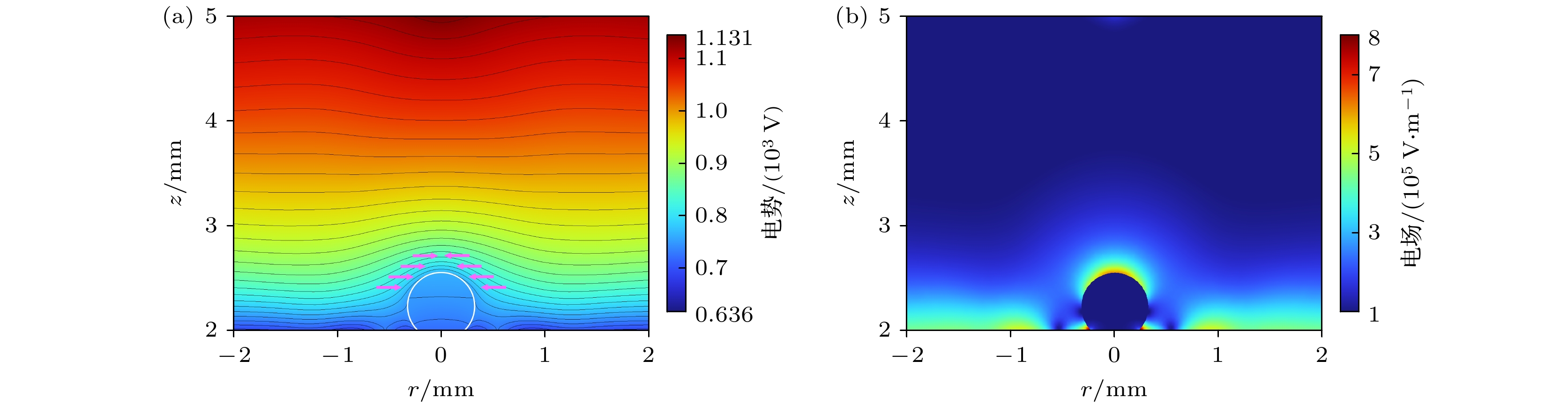 图 4 仿真模型计算域与网格划分 (a) 水滴蒸发流体力学模型与(b) 水滴及周围区域局部放大图; (c) 等离子体流体模型