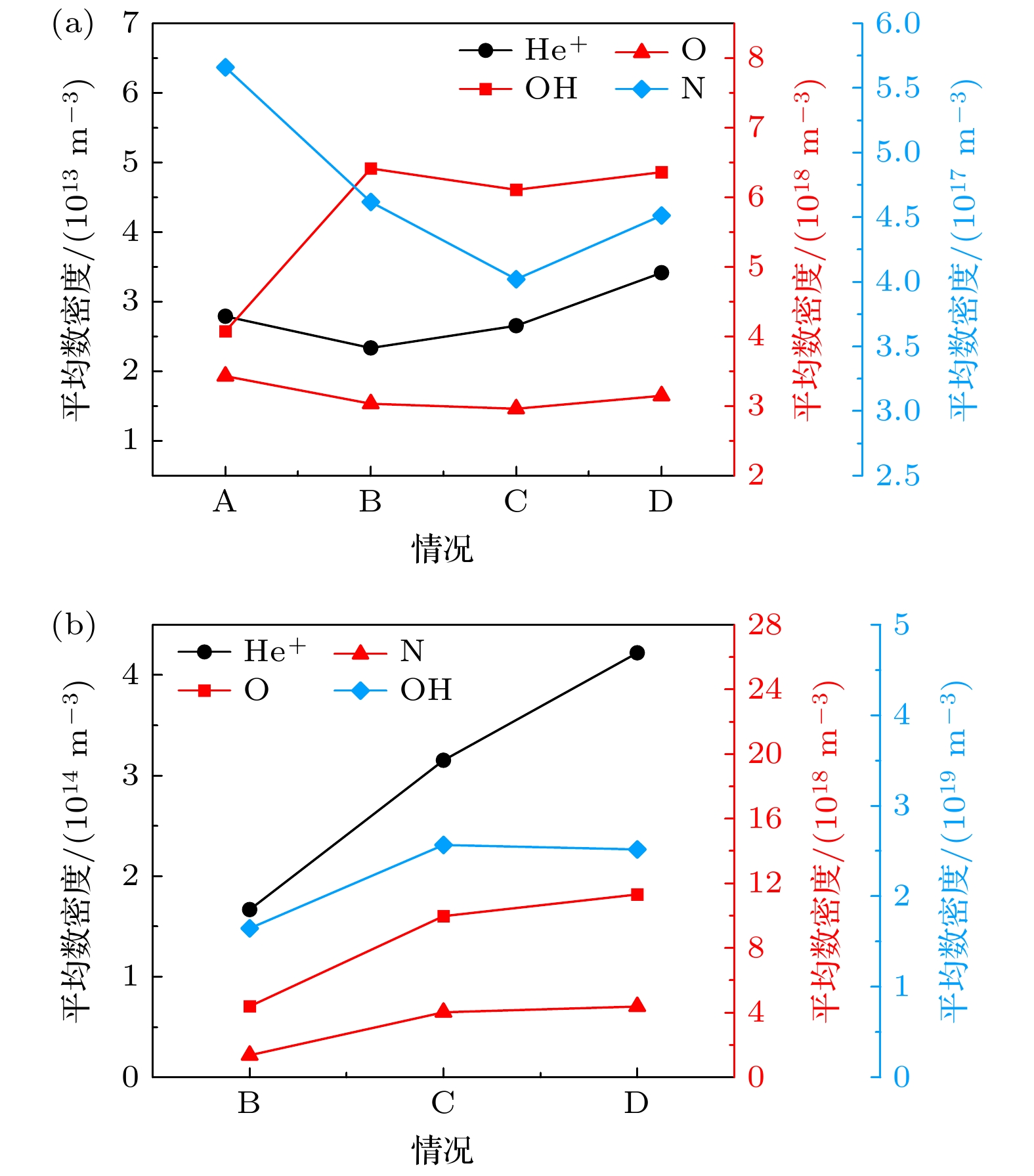 图 24 待处理物表面稳态时均数据的空间分布 (a)—(d) 各情况中活性粒子的数密度; (e) 情况D中He+的通量; (f) 各情况中OH的净生成速率