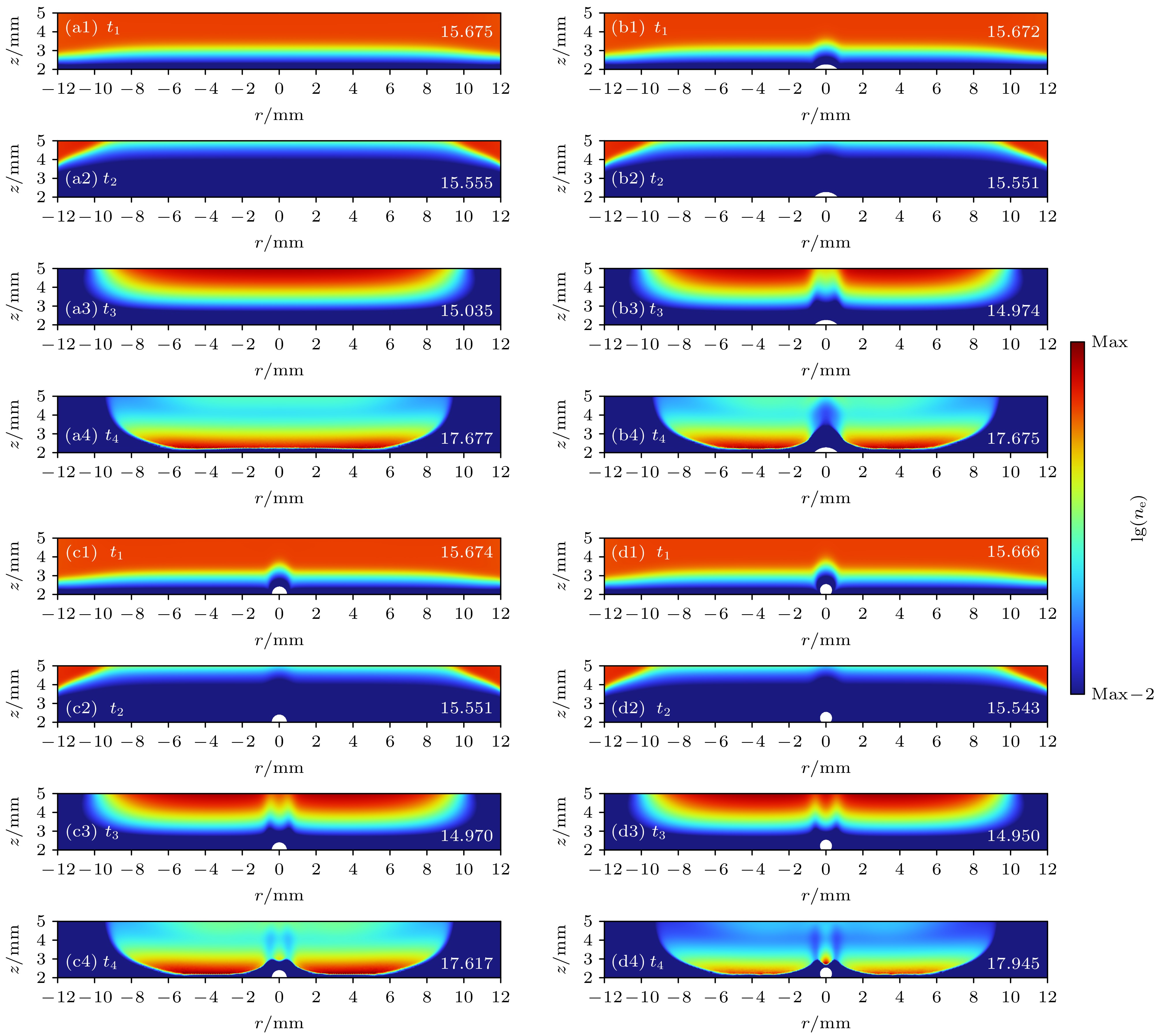 图 11 t1—t4时段DBD的对数ne空间分布, log10(ne)最大值被标注在图中右侧 (a1)—(a4) 情况A; (b1)—(b4) 情况B; (c1)—(c4) 情况C; (d1)—(d4) 情况D