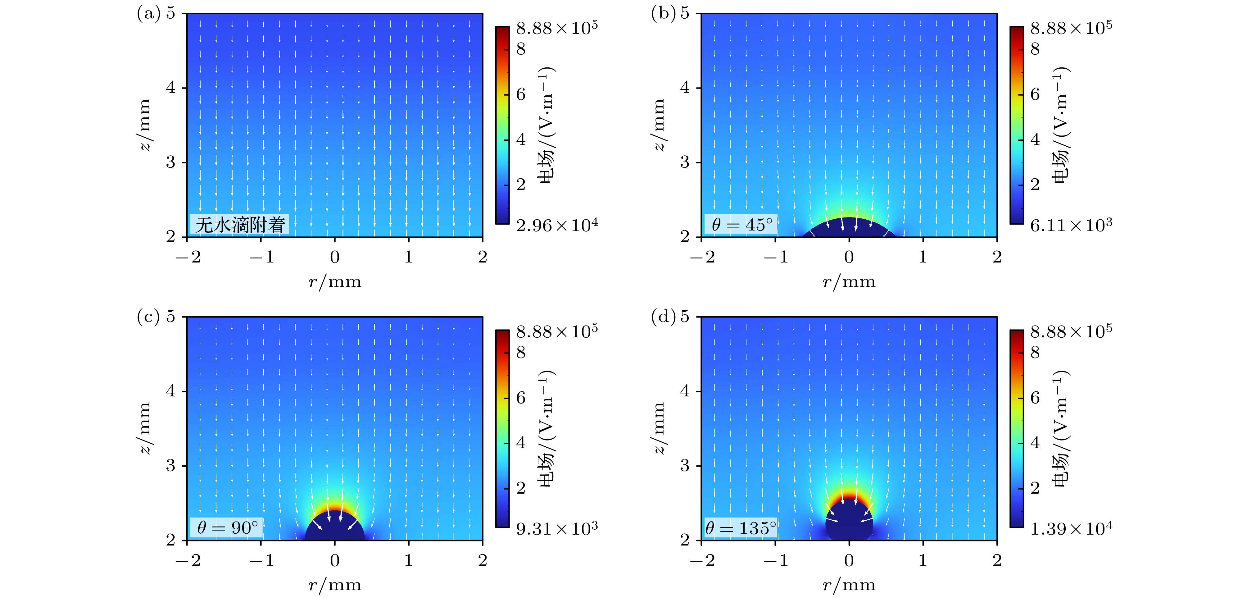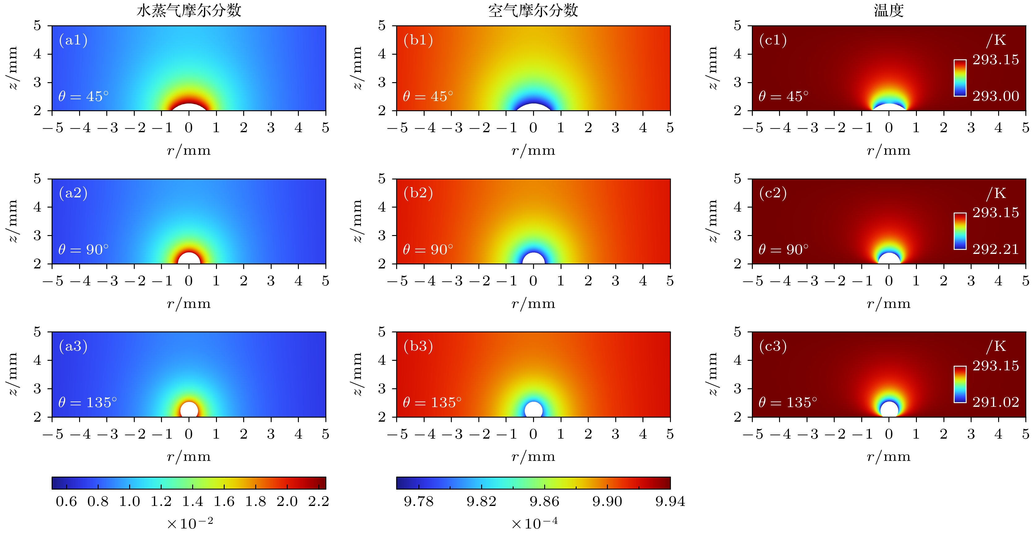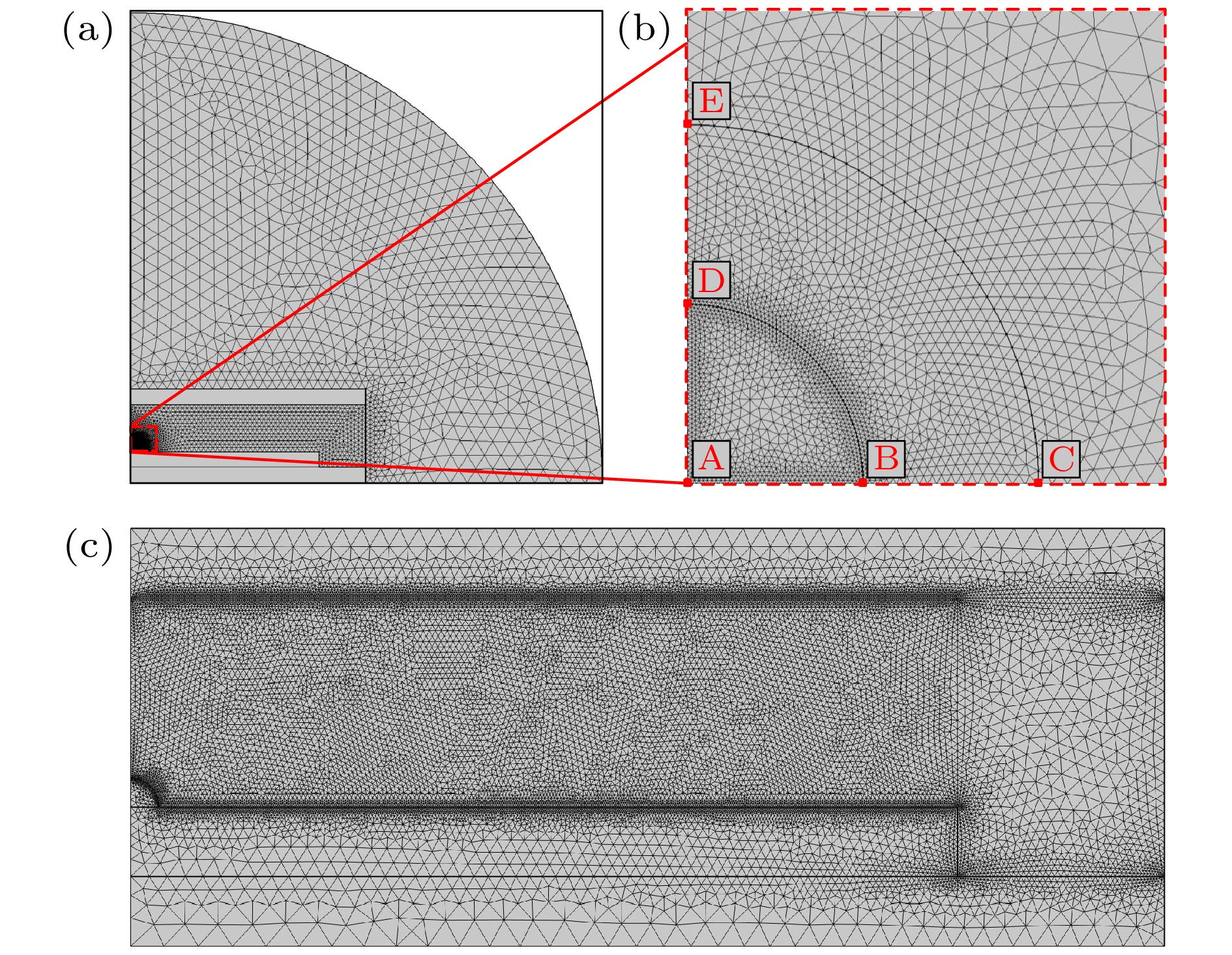图 4 仿真模型计算域与网格划分 (a) 水滴蒸发流体力学模型与(b) 水滴及周围区域局部放大图; (c) 等离子体流体模型