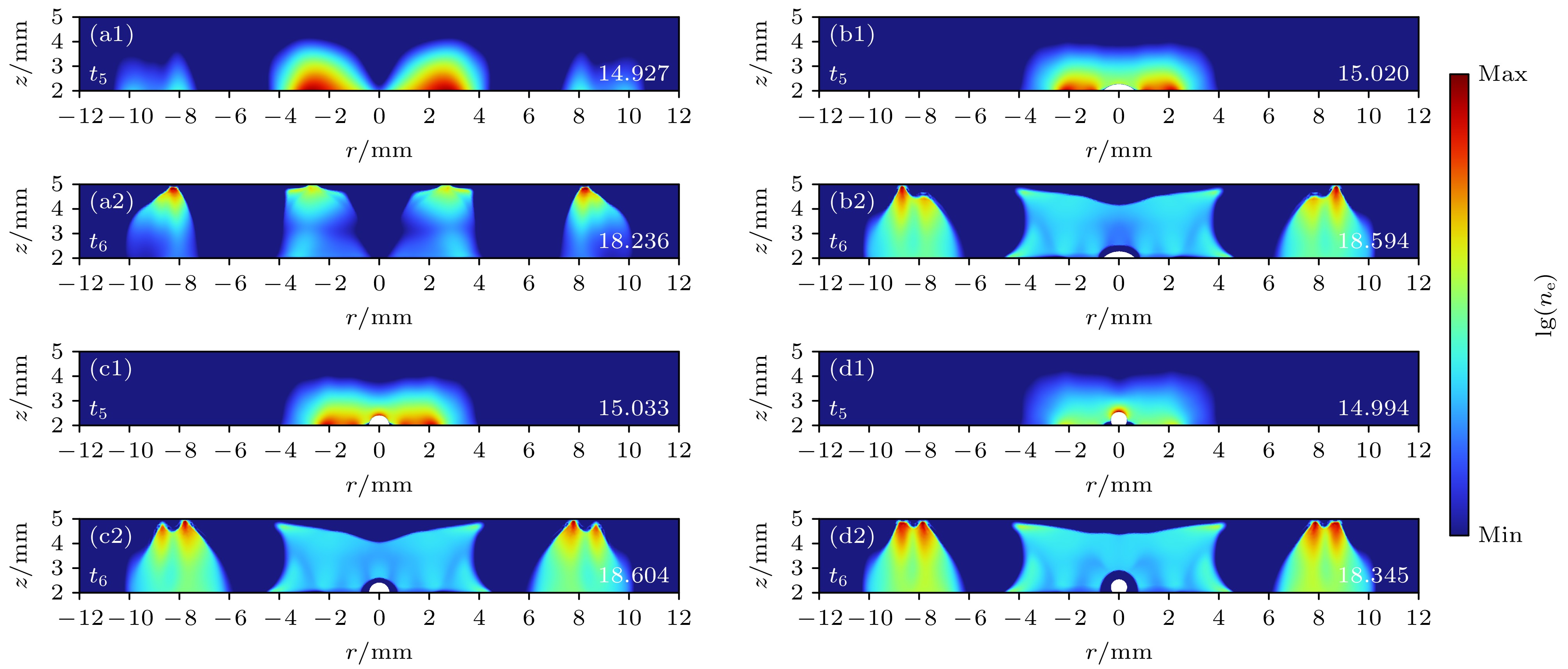 图 15 t5, t6时刻DBD的对数ne空间分布, log10(ne)最大值被标注在图中右下角 (a1), (a2) 情况A; (b1), (b2) 情况B; (c1), (c2) 情况C; (d1), (d2) 情况D