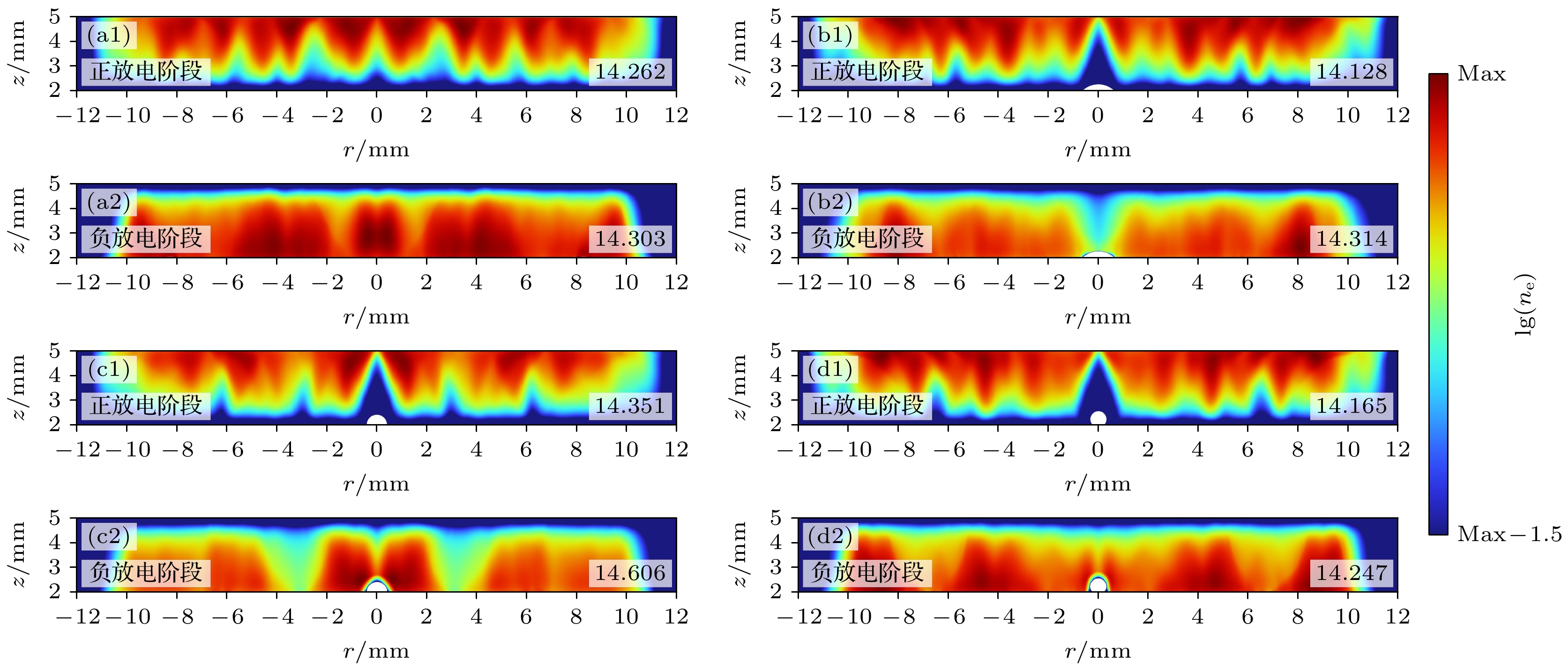 图 19 DBD的稳态正、负放电阶段时均对数ne空间分布, log10(ne)最大值被标注在图中右下角 (a1), (a2) 情况A; (b1), (b2) 情况B; (c1), (c2) 情况C; (d1), (d2) 情况D