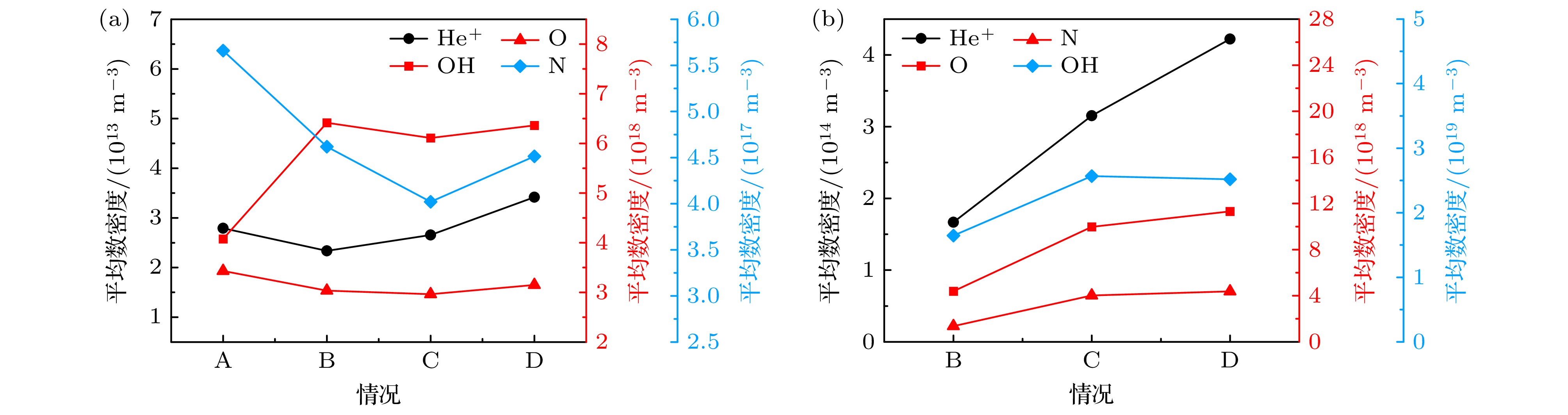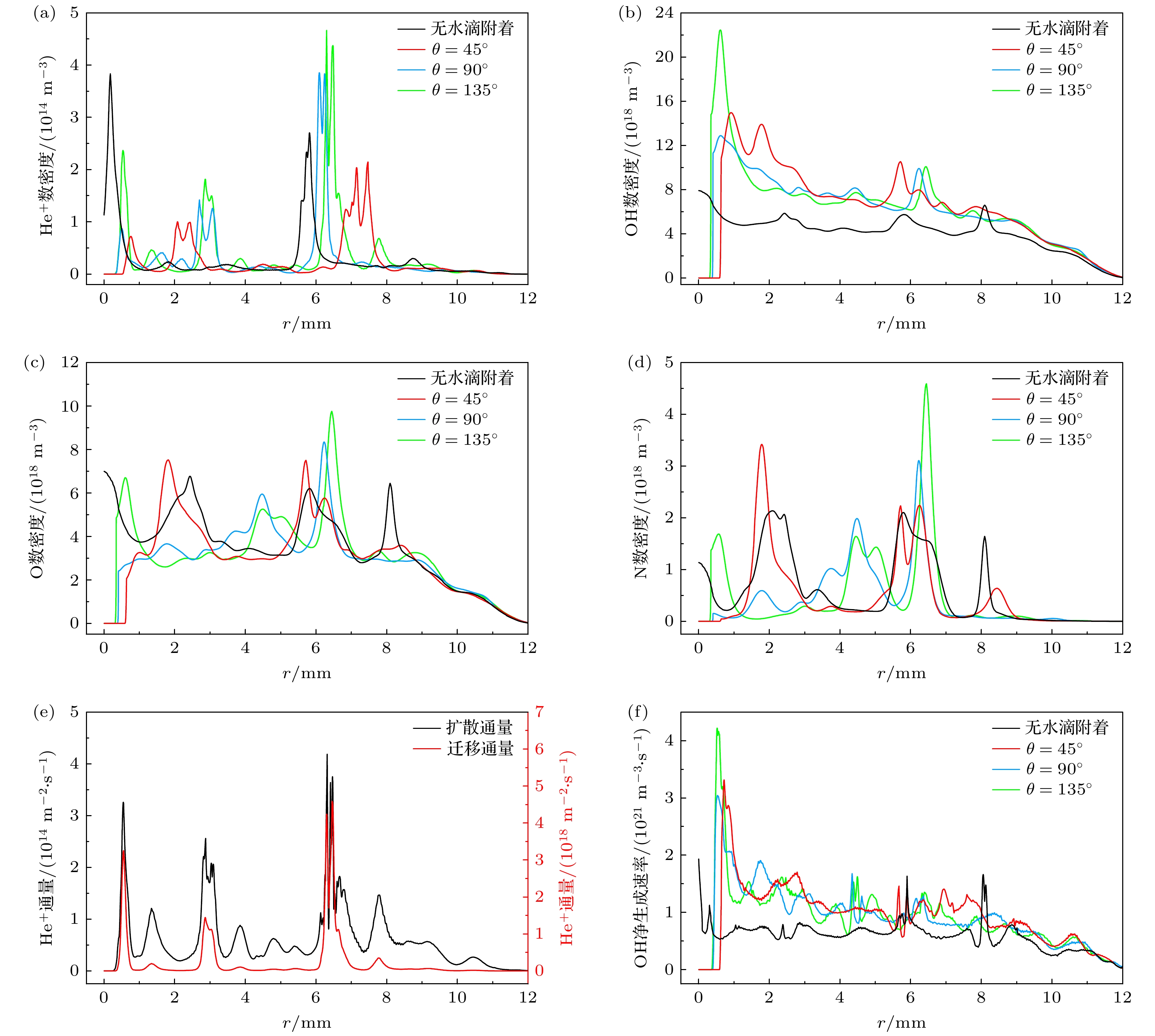 图 24 待处理物表面稳态时均数据的空间分布 (a)—(d) 各情况中活性粒子的数密度; (e) 情况D中He+的通量; (f) 各情况中OH的净生成速率