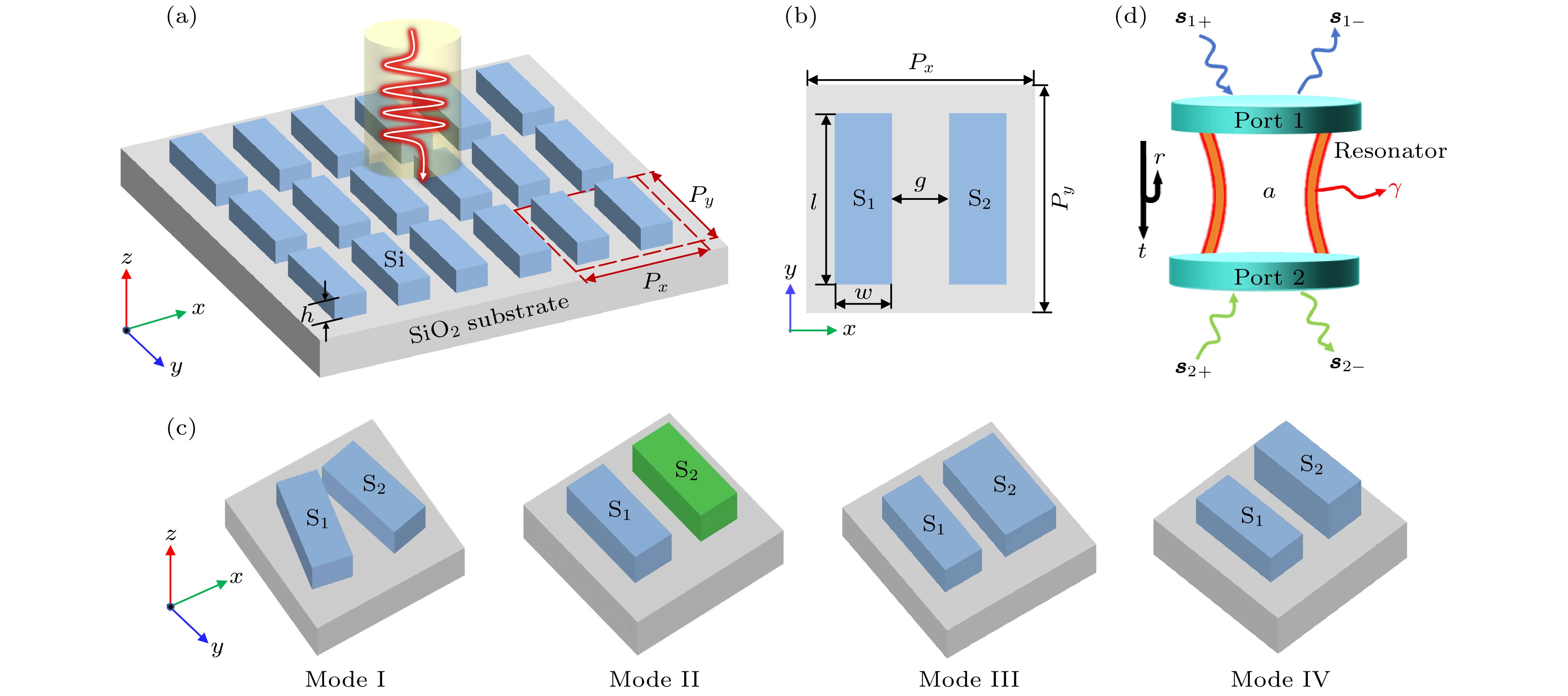 图 1 矩形全介质超表面 (a) 阵列结构示意图; (b) 元胞xy二维平面图; (c) 4种破缺方式下的元胞结构; (d) 时域耦合模式理论模型示意图
