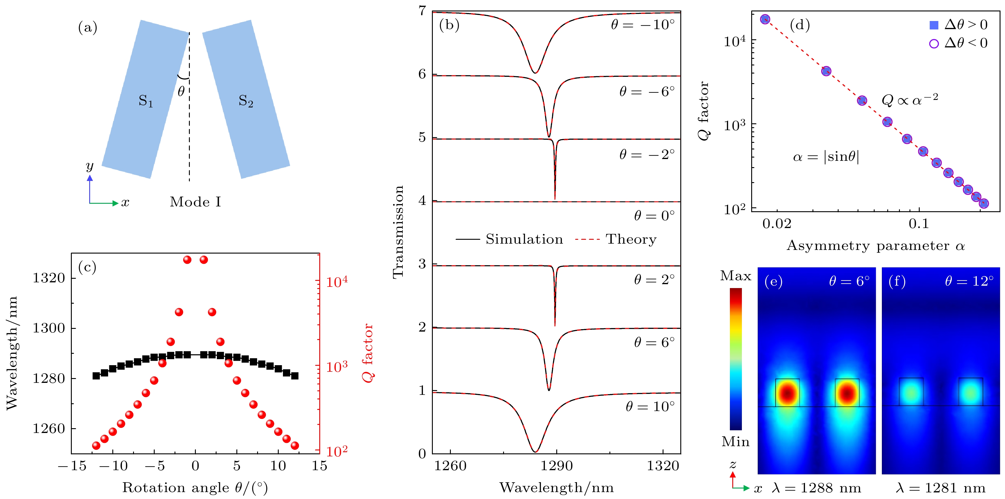 图 2 Mode Ⅰ调谐下超表面的仿真结果与理论分析 (a) 元胞的xy二维平面图; (b) 不同对称破缺角度θ下的仿真透射光谱与拟合曲线; (c) Q因子和共振波长随旋转角度θ的变化关系; (d) Q因子与不对称参数α的关系; (e), (f) θ = 6°, θ = 12°时, QBIC共振处硅棒中心xz截面电场分布
