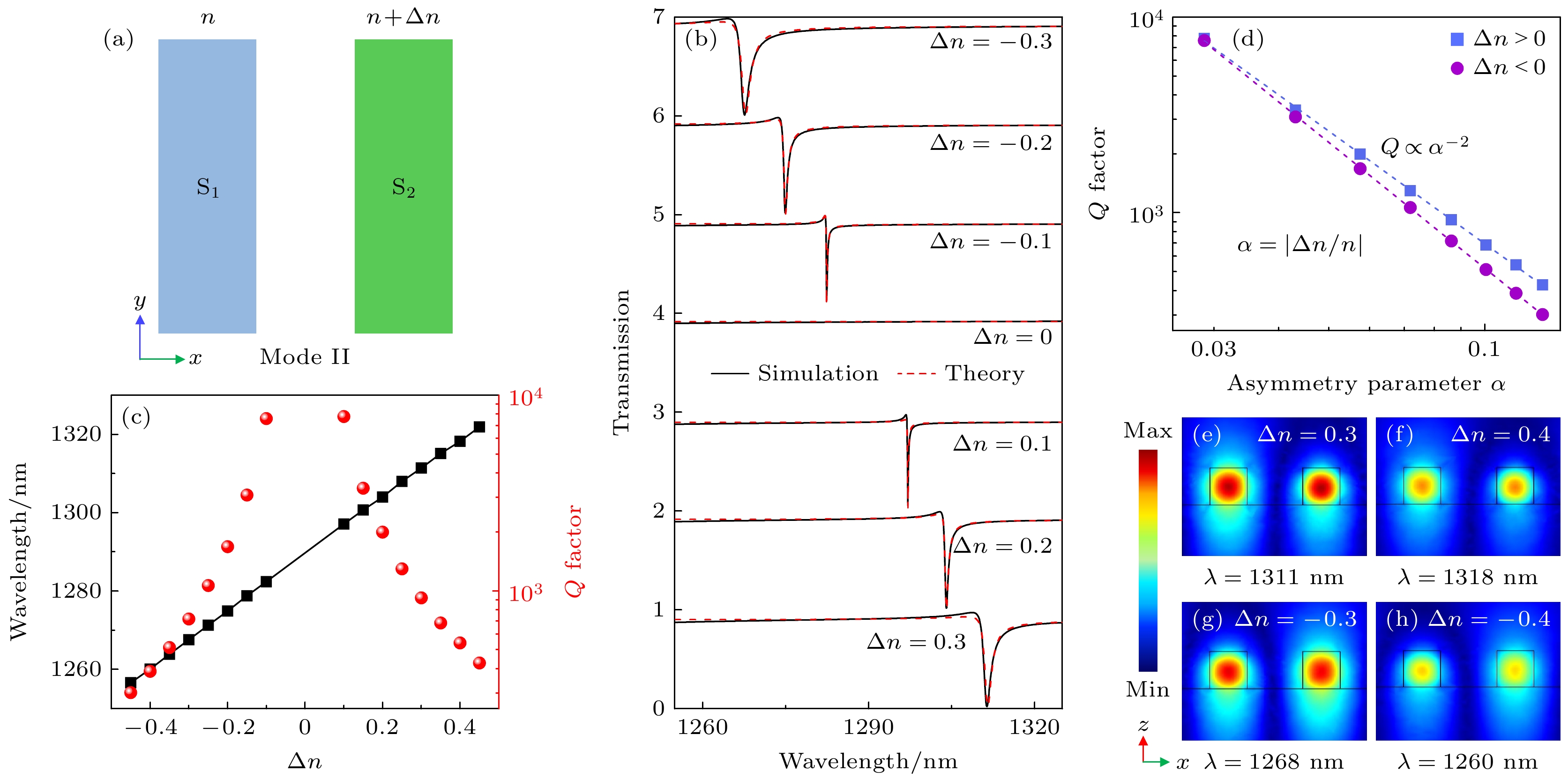 图 3 Mode Ⅱ调谐下超表面的仿真结果与理论分析 (a) 元胞的xy二维平面图; (b) 不同对称破缺折射率Δn下的仿真透射光谱与拟合曲线; (c) Q因子和共振波长随折射率Δn的变化关系; (d) Q因子与不对称参数α的关系; (e)—(h) Δn = ±0.3, Δn = ±0.4时QBIC共振处硅棒中心xz截面电场分布