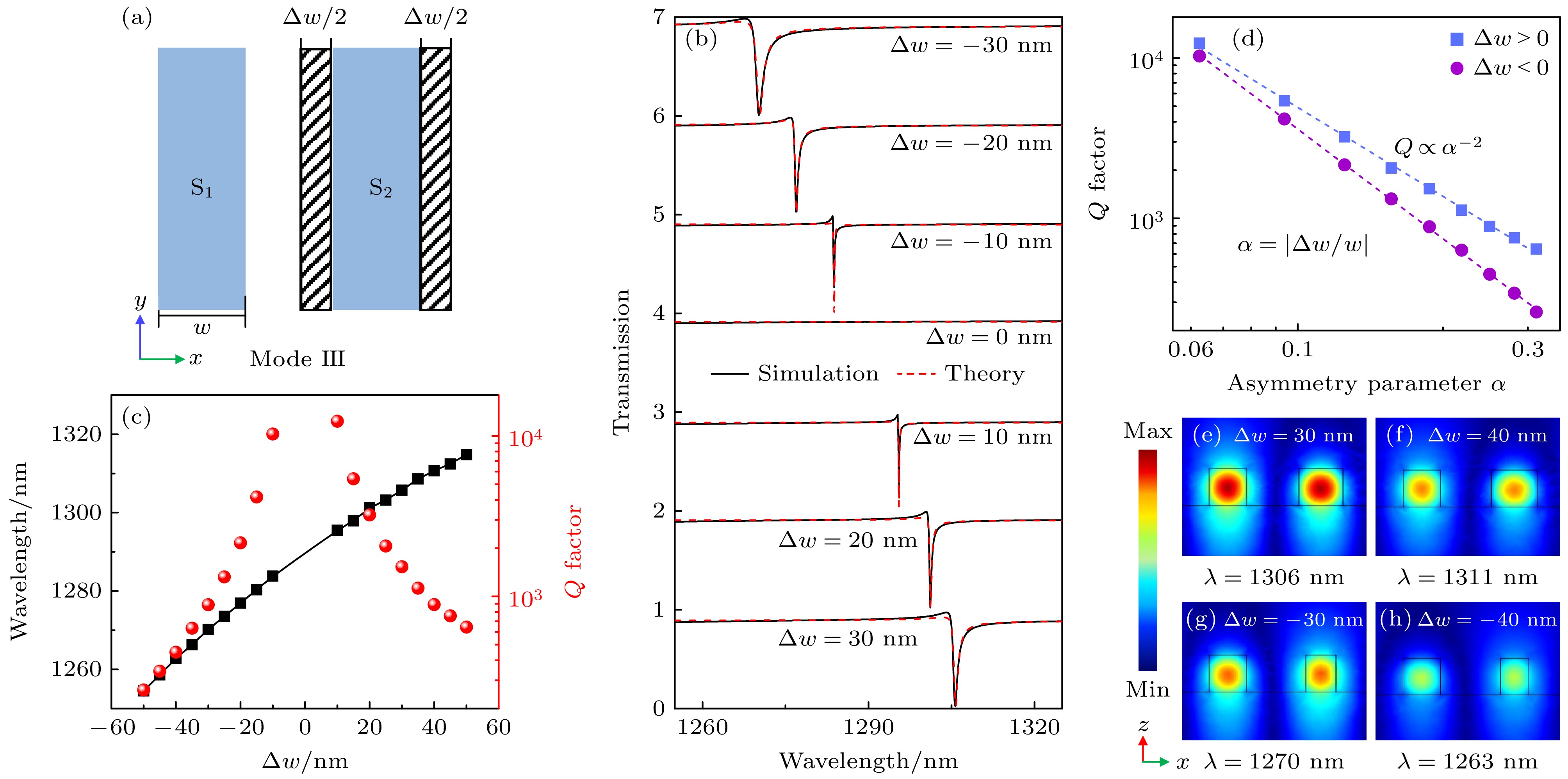 图 4 Mode Ⅲ调谐下超表面的仿真结果与理论分析 (a) 元胞的xy二维平面图; (b) 不同对称破缺宽度Δw下的仿真透射光谱与拟合曲线; (c) Q因子和共振波长随宽度Δw的变化关系; (d) Q因子与不对称参数α的关系; (e)—(h) Δw = ±30 nm, Δw = ±40 nm时QBIC共振处硅棒中心xz截面电场分布