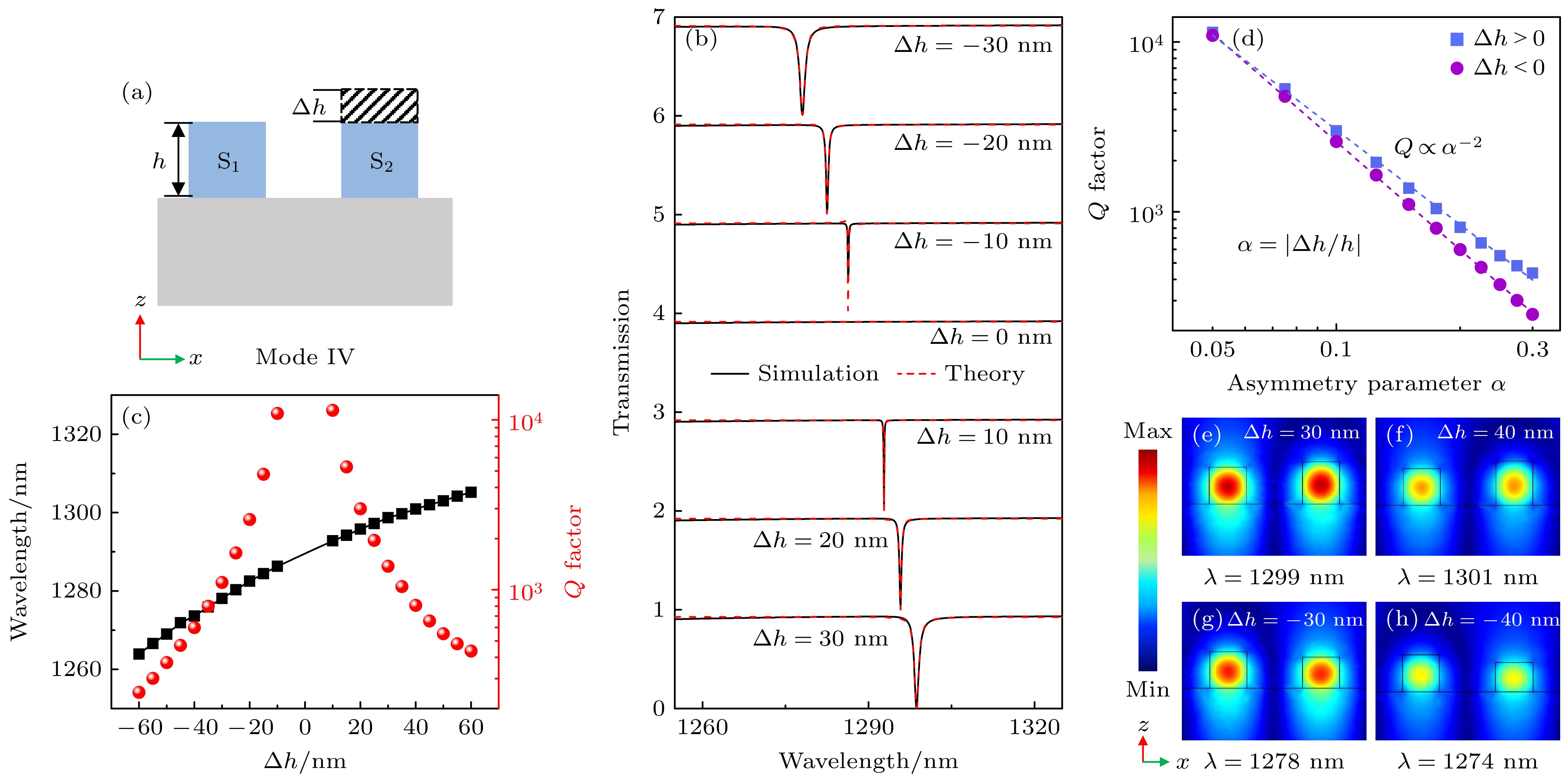 图 5 Mode Ⅳ调控下超表面的仿真结果与理论分析 (a) 元胞的xy二维平面图; (b) 不同对称破缺高度Δh下的仿真透射光谱与拟合曲线; (c) Q因子和共振波长随宽度Δh的变化关系; (d) Q因子与不对称参数α的关系; (e)—(h) Δh = ±30 nm, Δh = ±40 nm时QBIC共振处硅棒中心xz截面电场分布