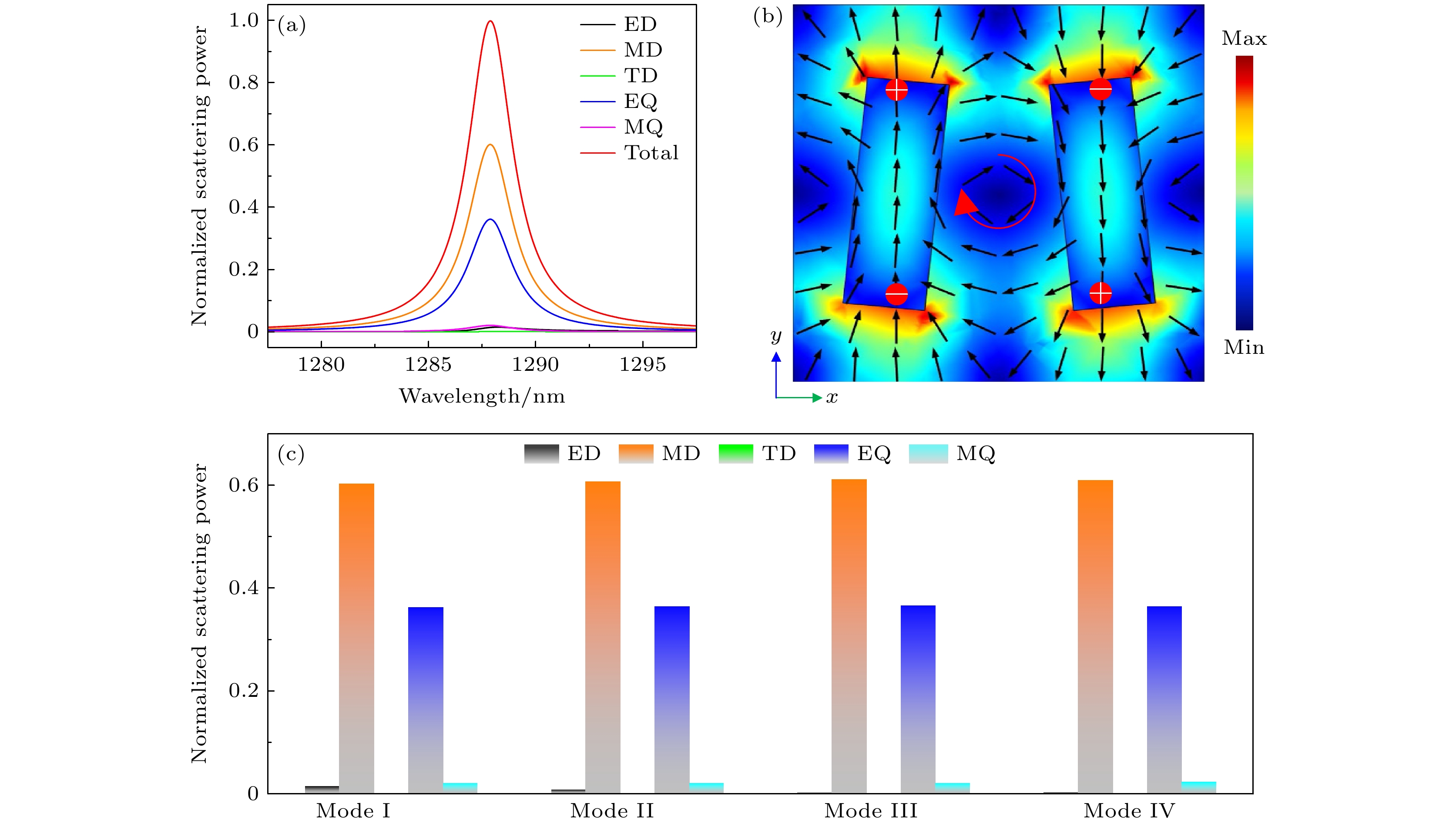Figure 6. Multipole decomposition analysis of the QBIC mechanism. Mode I control: (a) Different polar scattering powers; (b) the electric field distribution in the xy section of the cell; (c) when the asymmetry parameter is 0.1, the multipole moment contributions under the four breaking modes.