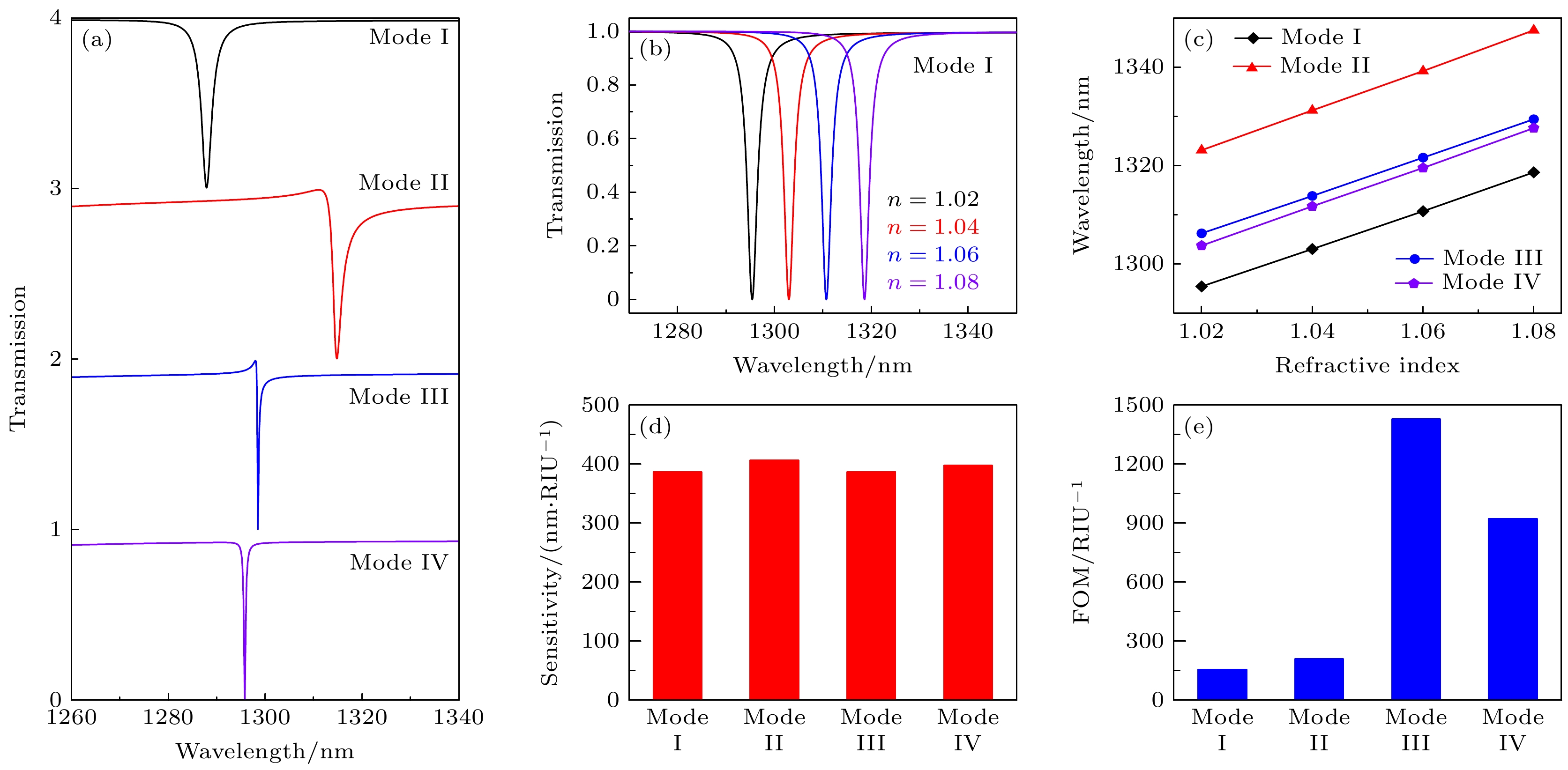 图 7 当α = 0.1时, 对4种破缺方式下超表面的传感性能进行研究 (a) 4种破缺方式下QBIC共振的透射光谱; (b) Mode Ⅰ破缺模式下, 超表面在不同折射率传感介质中的透射谱; (c) 4种破缺模式下的QBIC共振波长与环境折射率的关系; (d) 4种破缺模式下的灵敏度; (e) 4种破缺模式下的FOM