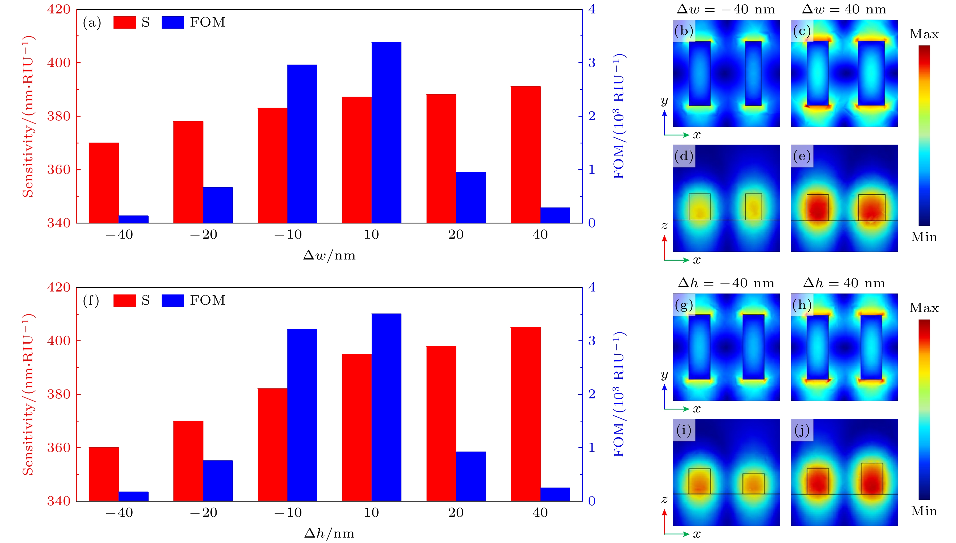 Figure 8. Effect of positive and negative breaks on the sensing performance of the metasurface. Mode III regulation: (a) Relationship between sensing performance and Δw; (b)–(e) when Δw = ±40 nm, the electric field distribution in the xy plane inside the cylinder and on the xz end face of the surface at QBIC resonance. Mode IV regulation: (f) Relationship between sensing performance and Δh; (g)–(j) when Δh = ±40 nm, the electric field distribution in the xy plane inside the cylinder and on the xz end face of the surface at QBIC resonance.