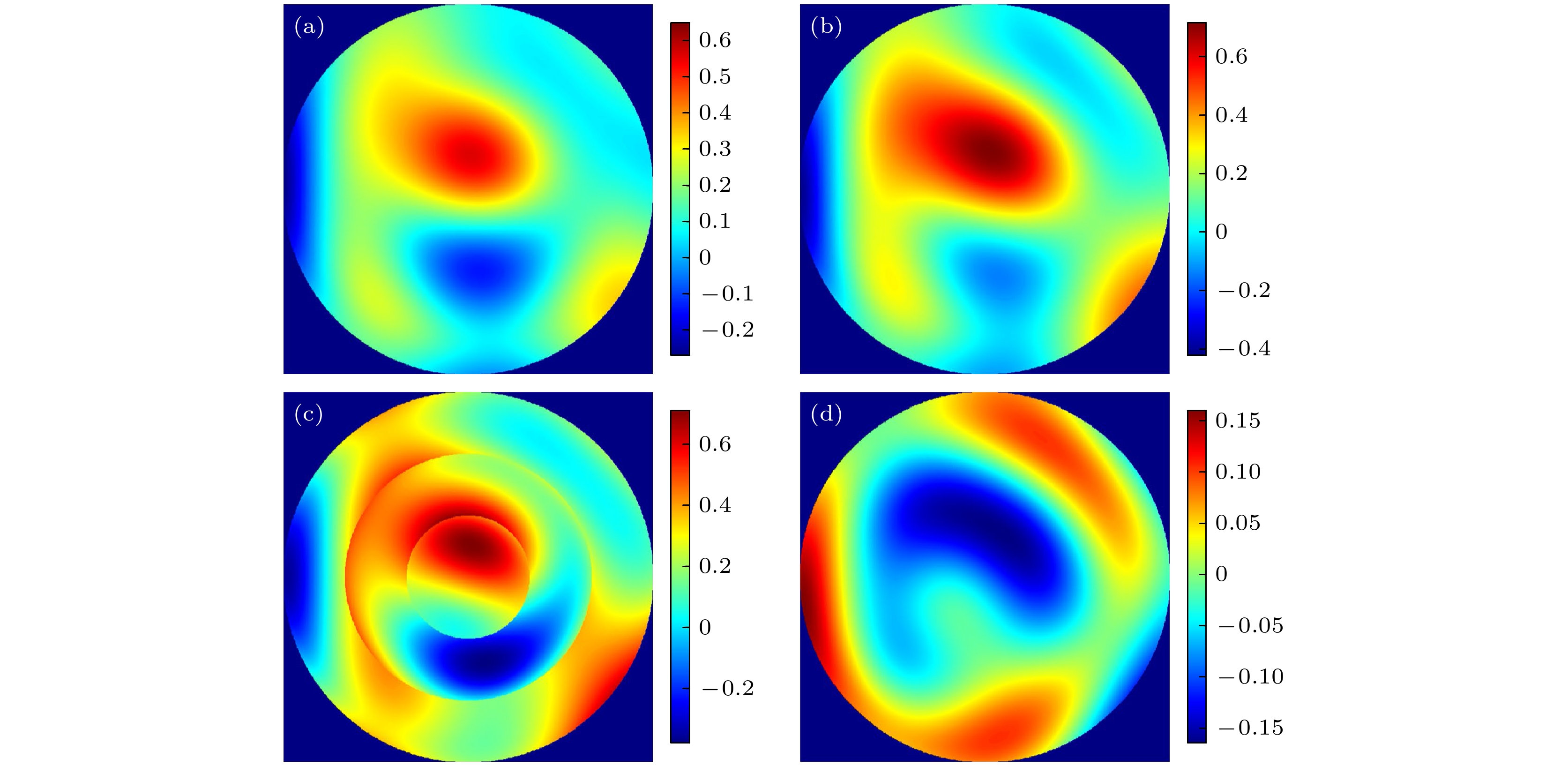 图 4 仿真实验的面形计算结果 (a) 圆形全口径面形计算结果; (b) 圆形全口径面形真值; (c) 圆形全口径面形与各子孔径测量误差的叠加(原始测量值); (d) 圆形全口径面形的计算结果与真值的差值
