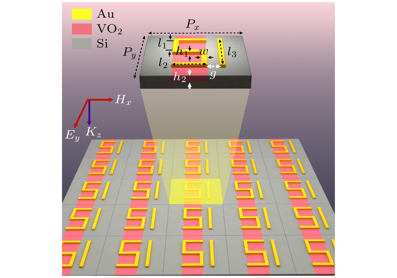 图 1 提出的超表面阵列结构及其单元结构示意图. 其中$ P_{x} $ = $ P_{y} $ = 60 μm, $ l_{1} $ = 17.5 μm, $ l_{2} $ = 25 μm, $ l_{3} $ = 50 μm, w = 5 μm, d = 3 μm, $ h_{1} $ = $ h_{2} $ = 0.2 μm