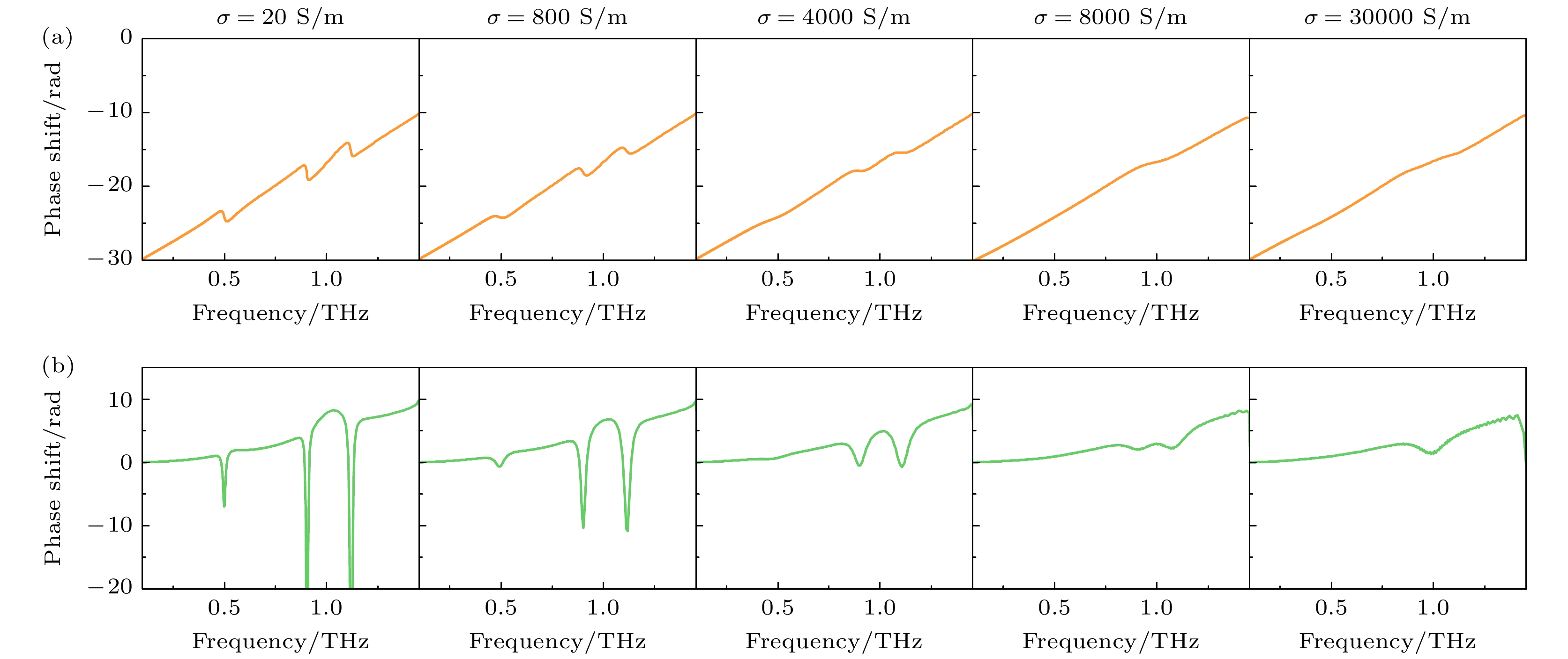 多极子 矩表达式 散射功率 电偶极子 (ED) $ p = \dfrac{1}{i\omega} \displaystyle\int J({\bf{r}}) d^3{\bf{r}} $ $ I_p = \dfrac{2\omega^4}{3 c^3} |{\bf{p}}|^2 $ 磁偶极子 (MD) $ m = \dfrac{1}{ic} \displaystyle\int {\bf{r}} \times J({\bf{r}}) d^3{\bf{r}} $ $ I_m = \dfrac{2\omega^4}{3 c^3} |{\bf{m}}|^2 $ 环偶极子 (TD) $ T = \dfrac{1}{10 c} \displaystyle\int \{ [{\bf{r}} \cdot J({\bf{r}})]{\bf{r}} - 2[{\bf{r}} \cdot {\bf{r}}]J({\bf{r}}) \} d^3{\bf{r}} $ $ I_T = \dfrac{2\omega^6}{3 c^5} |{\bf{T}}|^2 $ 电四偶极子 (EQ) $ Q_{\alpha\beta} = \dfrac{1}{2 i\omega} \displaystyle\int \{ r_{\alpha}J_{\beta}({\bf{r}}) + r_{\beta}J_{\alpha}({\bf{r}}) - \dfrac{2}{3}[{\bf{r}} \cdot J({\bf{r}})]\delta_{\alpha\beta} \} d^3{\bf{r}} $ $ I^e_Q = \dfrac{\omega^6}{5 c^5} \displaystyle\sum|Q_{\alpha\beta}|^2 $ 磁四偶极子 (MQ) $ M_{\alpha\beta} = \dfrac{1}{3 c} \displaystyle\int \{ [{\bf{r}} \times J({\bf{r}})]_{\alpha}r_{\beta} + [{\bf{r}} \times J({\bf{r}})]_{\beta}r_{\alpha} \} d^3{\bf{r}} $ $ I^m_Q = \dfrac{\omega^6}{20 c^5} \displaystyle\sum|M_{\alpha\beta}|^2 $ 表 2 类电磁诱导透明超表面的群延时性能与本研究的对比
