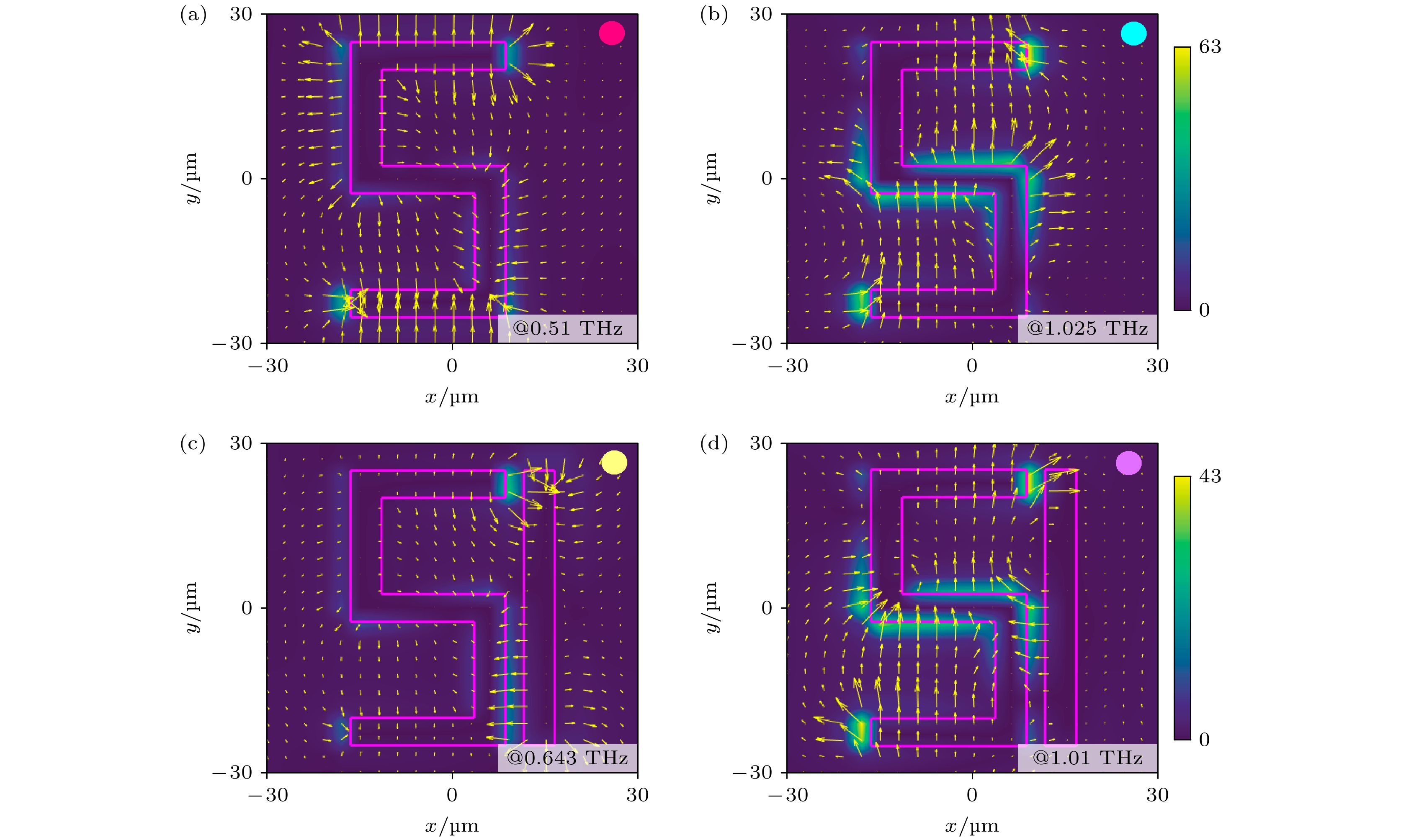图 3 阵列结构在x-y平面的电场强度分布. S型开口环在(a) 0.51 THz与(b) 1.025 THz处电场分布; (c)(d) 两个透明窗在0.643 THz和1.01 THz处的电场分布; 粉色线为单元结构轮廓, 黄色箭头表示电场方向, 颜色条为共振强度, 这里(a)(b)共用一个颜色条, (c)(d)共用一个颜色条; 带颜色的实心圆对应图2中透射谱的共振位置