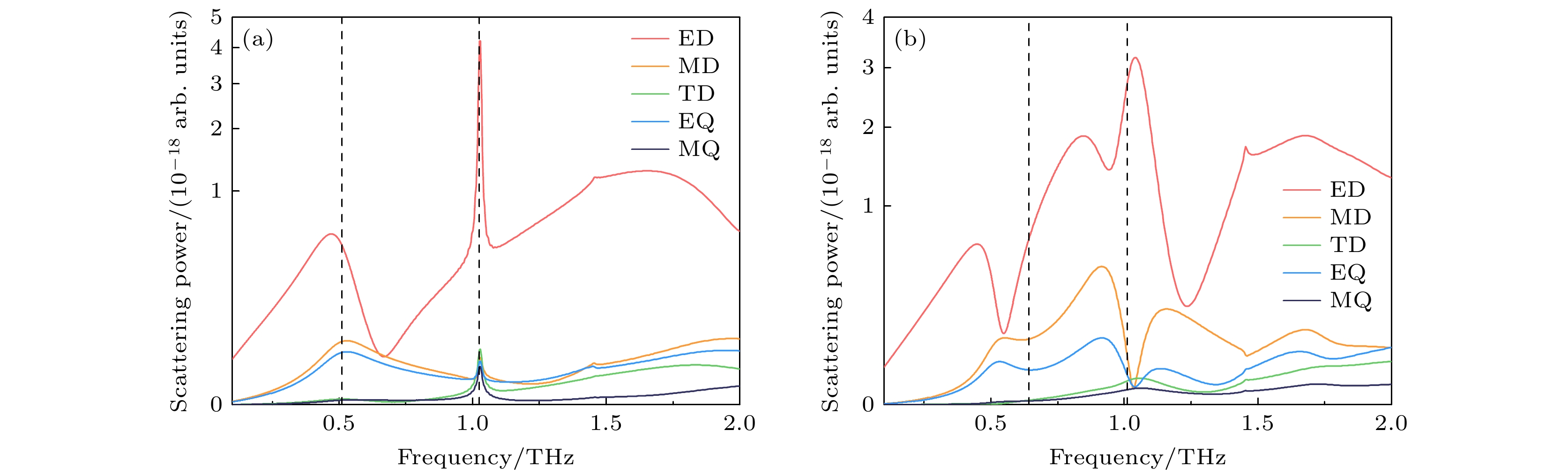 Figure 5. scattered power spectra. (a) Scattered power spectra of the S-shaped split-ring; (b) Scattered power spectra of the combined structure. ED, MD, TD, EQ, and MQ denote electric dipole, magnetic dipole, ring dipole, electric quadrupole, and magnetic quadrupole, respectively; black dashed lines denote resonance positions.