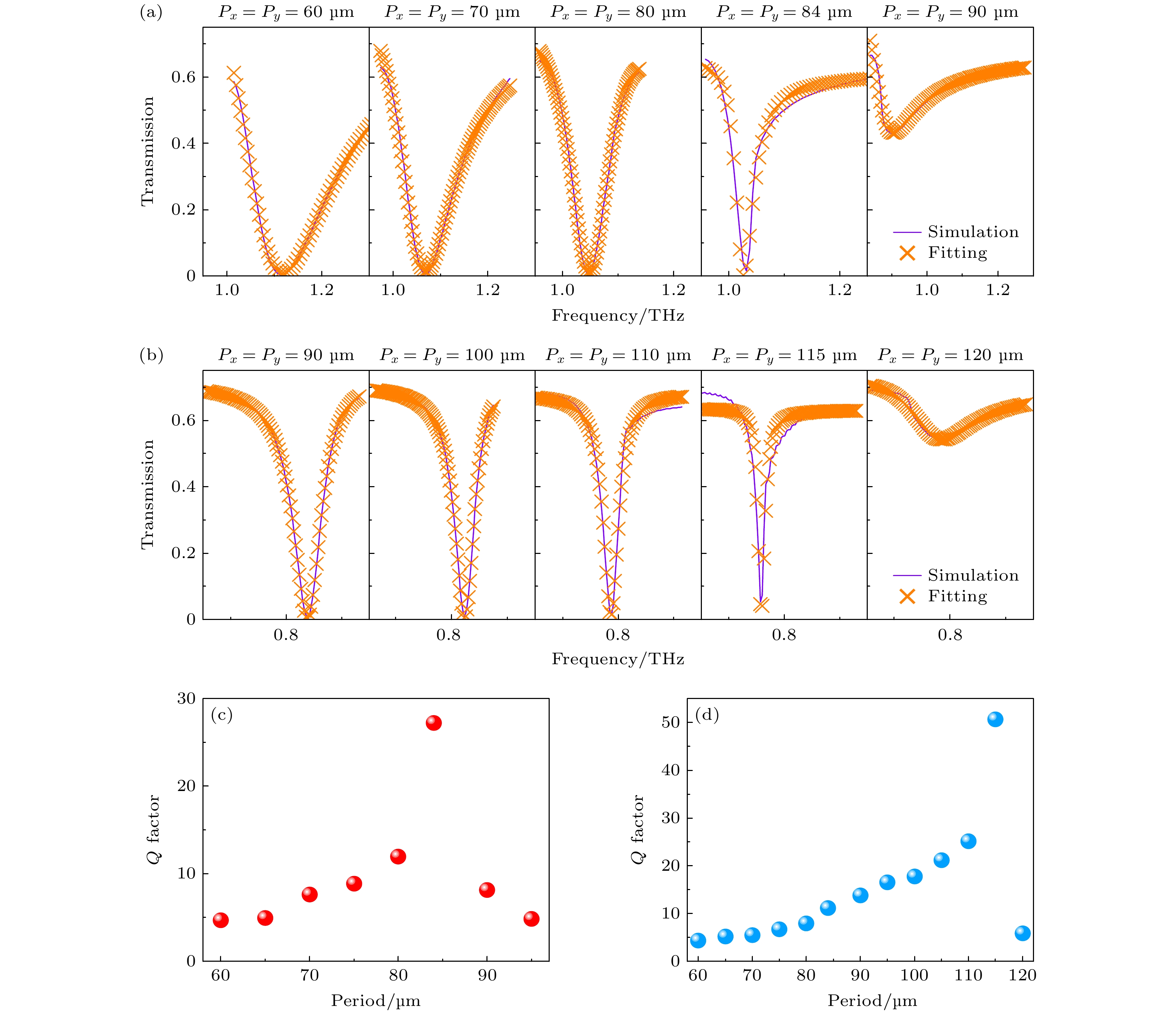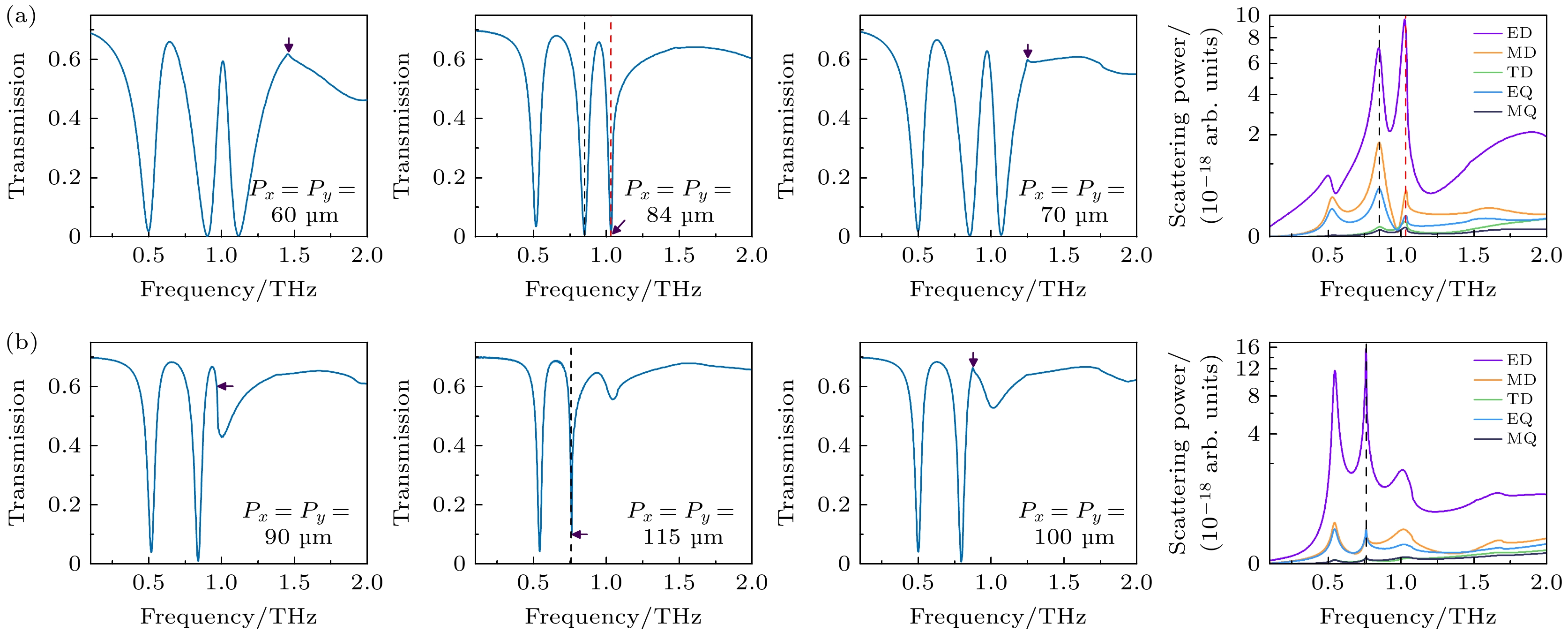 Figure 6. With fixed structural parameters, the simulated transmission spectra and multipole decomposition scattering power spectra of the combined structure are presented when the periods $ P_x $ and $ P_y $ are varied from (a) 60 μm to 84 μm and from (b) 90 μm to 115 μm. The lattice mode $ f_{{\rm{LM}}(\pm1, 0)} $ is denoted by black triangular symbols, with the red dashed line indicating the frequency position of HFHM and the black dashed line indicating the frequency position of LFHM.