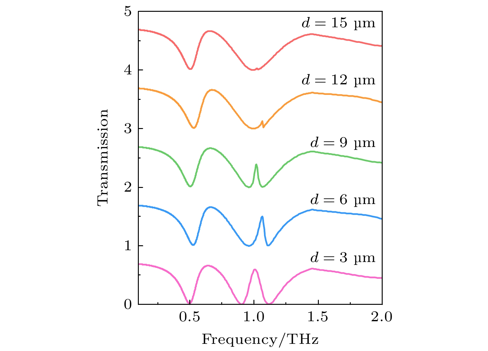 The phenomenon of electromagnetically induced transparency (EIT)-like in terahertz (THz) metasurfaces facilitates agile manipulation of electromagnetic wave transmission windows and the deceleration of light, rendering it suitable for applications in modulators, absorbers, slow light devices, and more. Traditional design methodologies focus on the coupling between bright-dark modes and bright-bright modes within the unit cell, leveraging interference cancellation effects to regulate electromagnetic wave transmission. Notably, the periodicity of the array structure also plays a pivotal role in modulating the amplitude and resonance intensity of the transparent window, a phenomenon termed lattice-induced transparency (LIT). In this paper, we introduce a gold nanorod structure and an S-shaped gold split-ring resonator supported on a vanadium dioxide (${\rm{VO}}_{2}$) thin film to investigate LIT. Unlike conventional structures that solely consider single bright-bright or bright-dark mode coupling, our proposed structure incorporates both bright-bright and bright-dark modes coupling. Furthermore, the dark mode in our structure is not a conventional multipolar mode but rather a surface lattice resonance (SLR) arising from the coupling between lattice modes and the localized surface plasmon resonance (LSPR) of the structure itself. Through the analysis of simulated transmission spectra for the individual gold nanorod and S-shaped split-ring structures, we observed that the gold nanorod exhibits LSPR at 0.985 THz, whereas the S-shaped split-ring structure demonstrates LSPR and SLR at 0.51 THz and 1.025 THz, respectively. When combined, these structures form transparent windows with transmission rates of 66.03% and 59.4% at 0.643 THz and 1.01 THz due to the interplay of bright-bright and bright-dark modes coupling. Upon examining the electric field distribution in the x-y plane, we found that the electric field energy is predominantly concentrated on the S-shaped split-ring. To gain deeper insights into each resonance mode, we employed multipolar decomposition to quantify resonance scattering energy. Our findings revealed that both transparent windows are predominantly governed by electric dipole scattering energy. Further investigations showed that as the array structure’s period varies from 60 μm to 95 μm, the lattice mode progressively couples into the high frequency transmission valley (1.031 THz), giving rise to a high frequency hybrid mode (HFHM). The Q value of this mode initially increases and then decreases, peaking at 27 when the period is 84 μm. Similarly, as the period continues to increase, the lattice mode couples into the low frequency resonance valley (0.76 THz), forming a low frequency hybrid mode (LFHM) with a Q value that reaches a maximum of 51 at 115 μm—approximately an order of magnitude higher than that at a period of 60 μm. Additionally, as the periodicity increases, the near field coupling effect between adjacent units diminishes, leading to the gradual disappearance of the two transparent windows. To achieve active control over these transparent windows, we varied the conductivity of ${\rm{VO}}_{2}$ from 20 S/m to 30000 S/m, resulting in a decrease in the transmission amplitudes of the two transparent windows to 37.58% and 3.39%, respectively. Finally, we investigated the slow light effect of the two transparent windows, comparing the maximum group delay between them, which was found to be 8.1 ps. The terahertz metasurface proposed in this study opens up avenues for the design of dynamically tunable sensing and slow light devices in the future. -