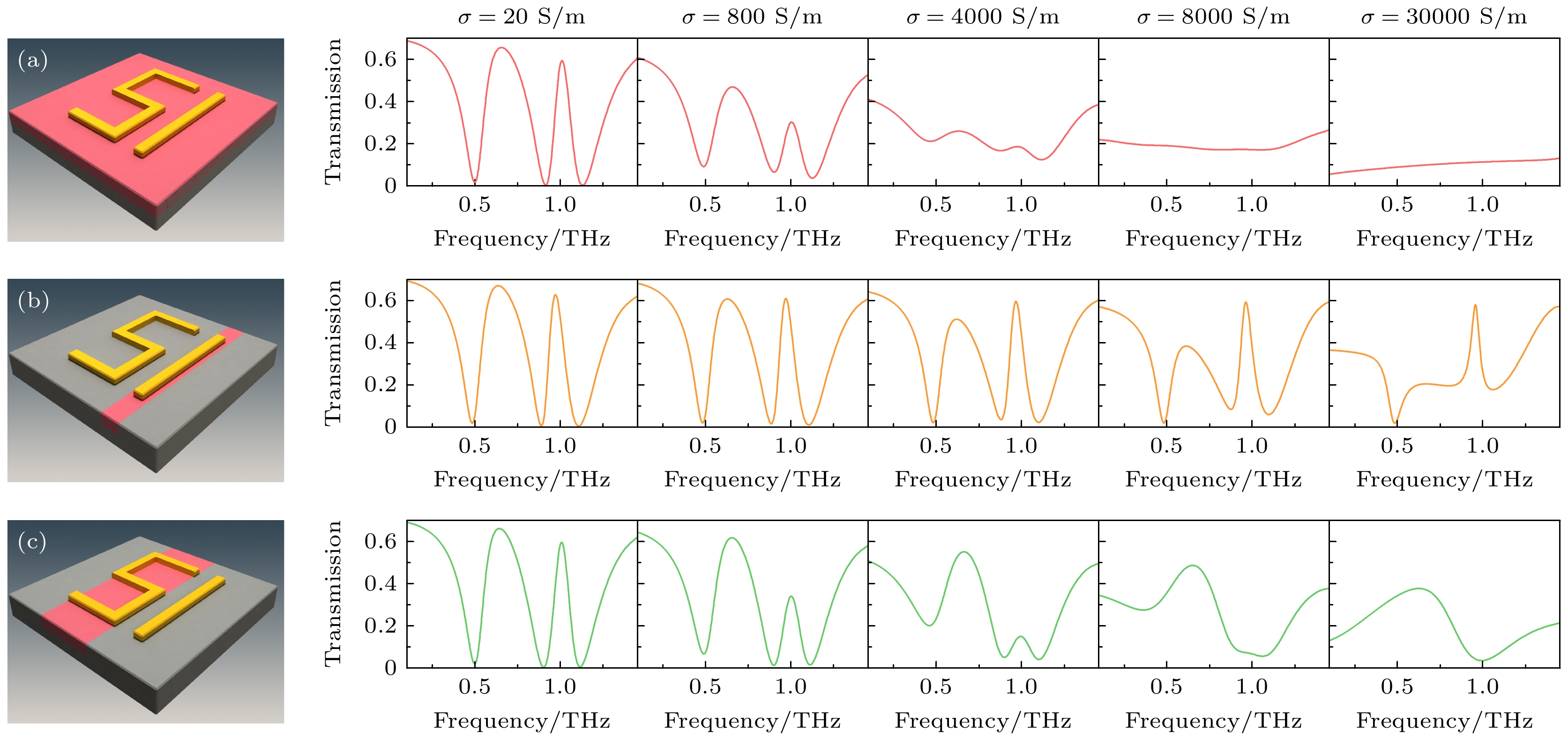图 9 当VO2电导率σ从20 S/m增加到30000 S/m时, 三种典型结构的透射光谱变化情况: (a) VO2完全覆盖基底表面; (b) VO2位于金纳米条下方; (c) VO2位于S型金开口环下方