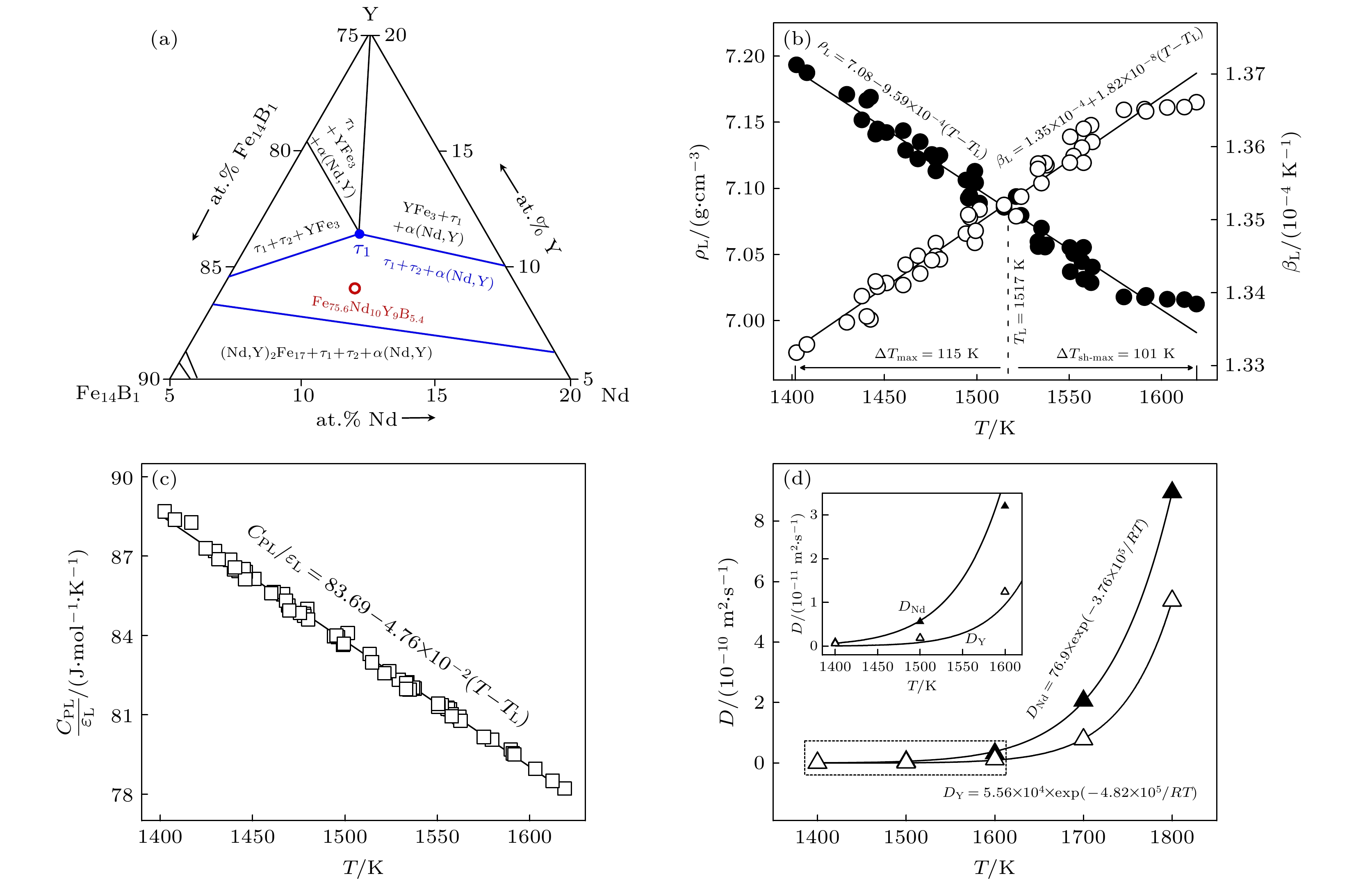 图 1 四元Fe75.6Nd10Y9B5.4合金的亚稳和稳定液态热物理性质随温度变化规律 (a) 合金成分在Fe-Nd-Y-B相图773 K等温截面中的位置; (b) 密度与热膨胀系数; (c) 比热与辐射率之比; (d) Nd与Y元素扩散系数