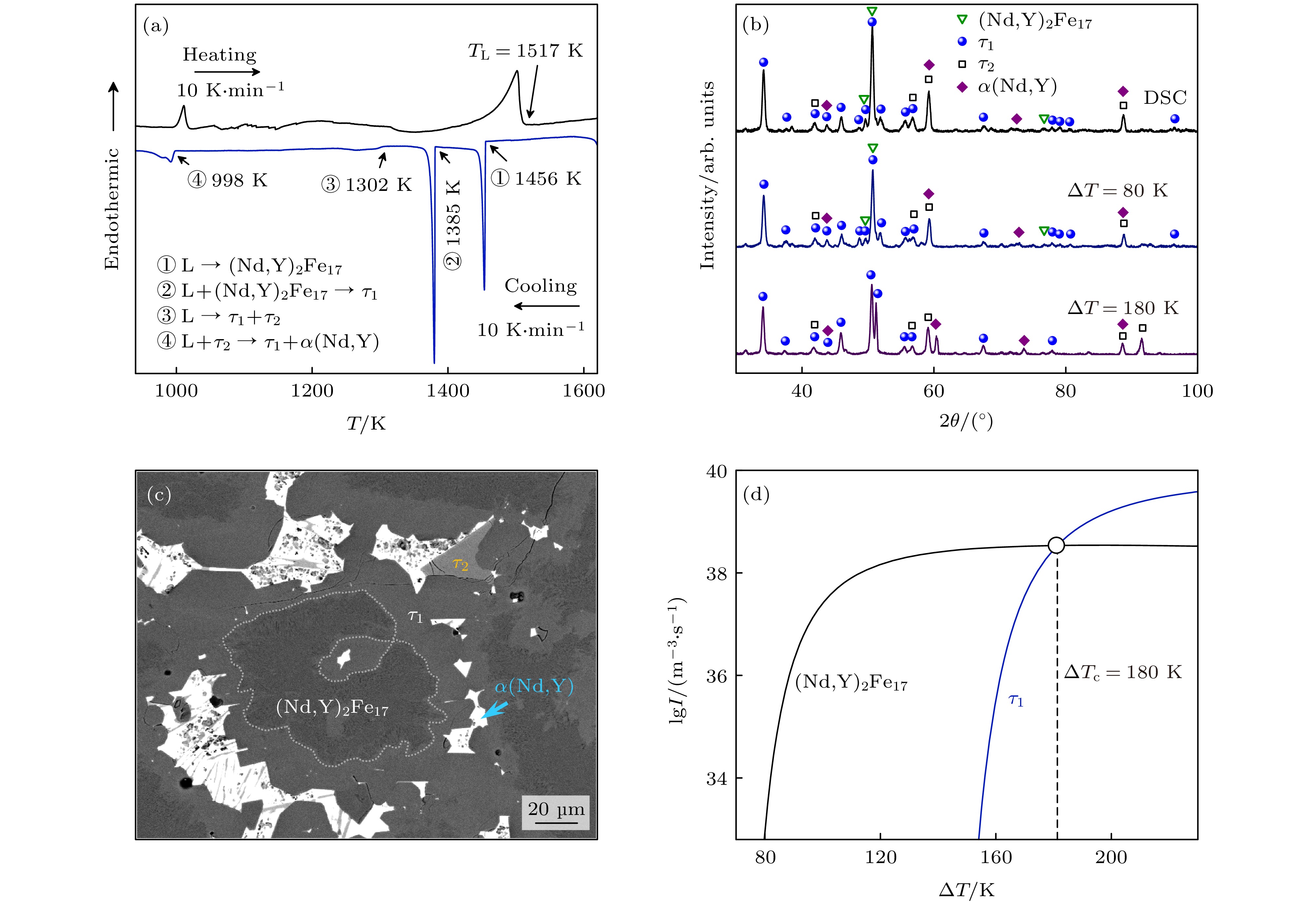 图 2 四元Fe75.6Nd10Y9B5.4合金的近平衡凝固路径 (a) DSC曲线; (b) XRD图谱; (c) 凝固组织; (d) (Nd, Y)2Fe17与τ1相形核率