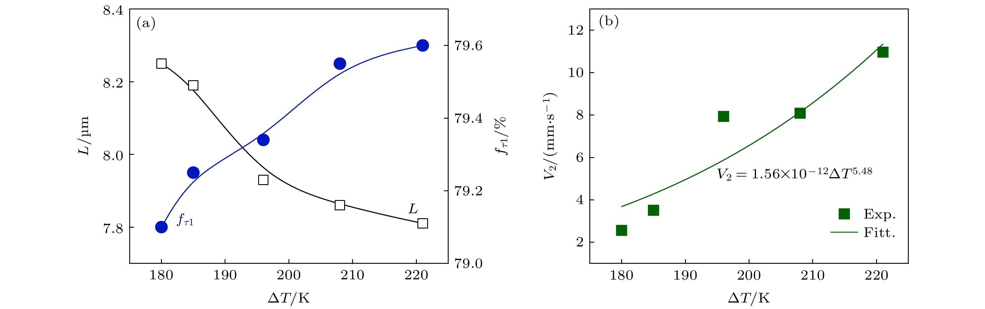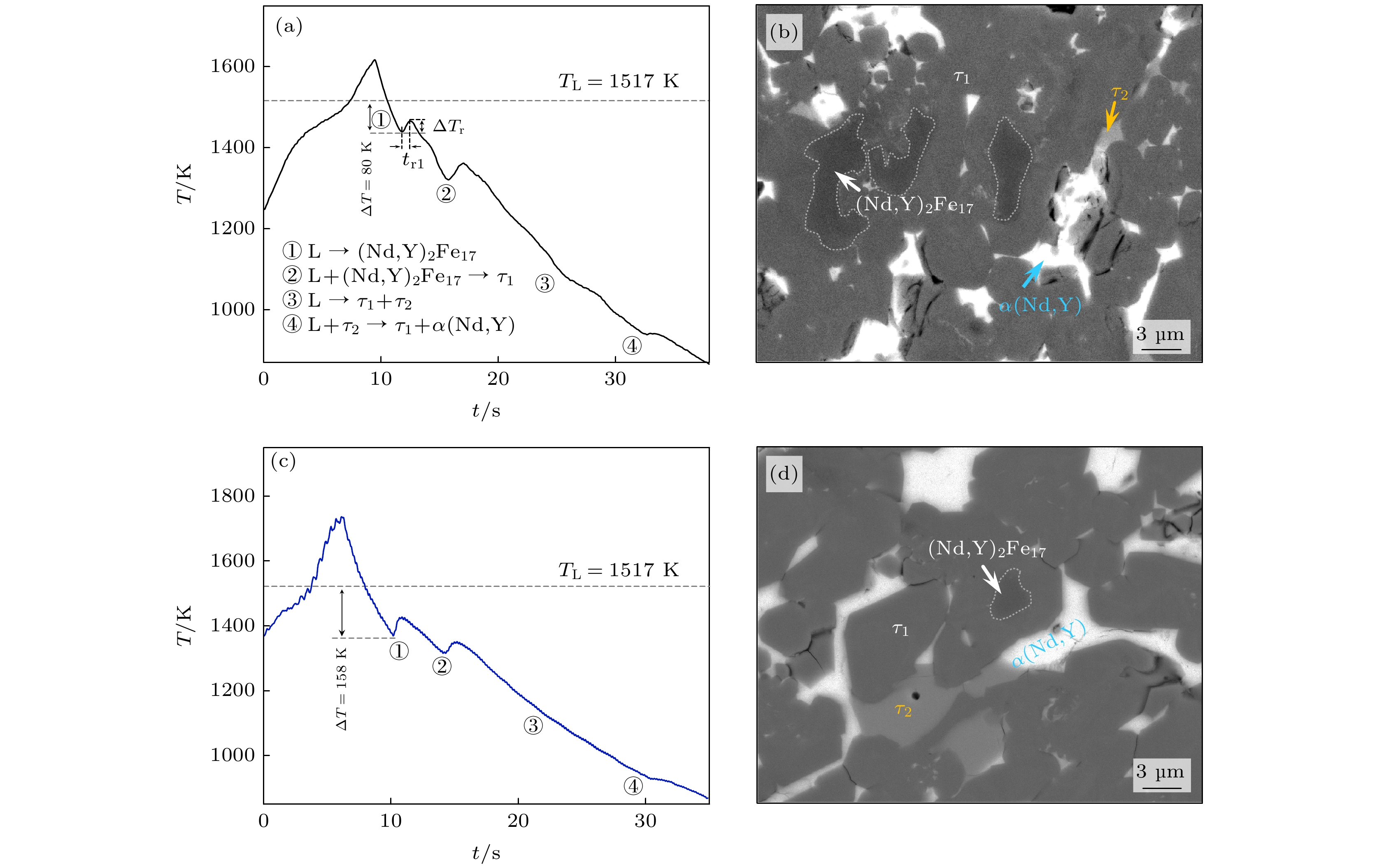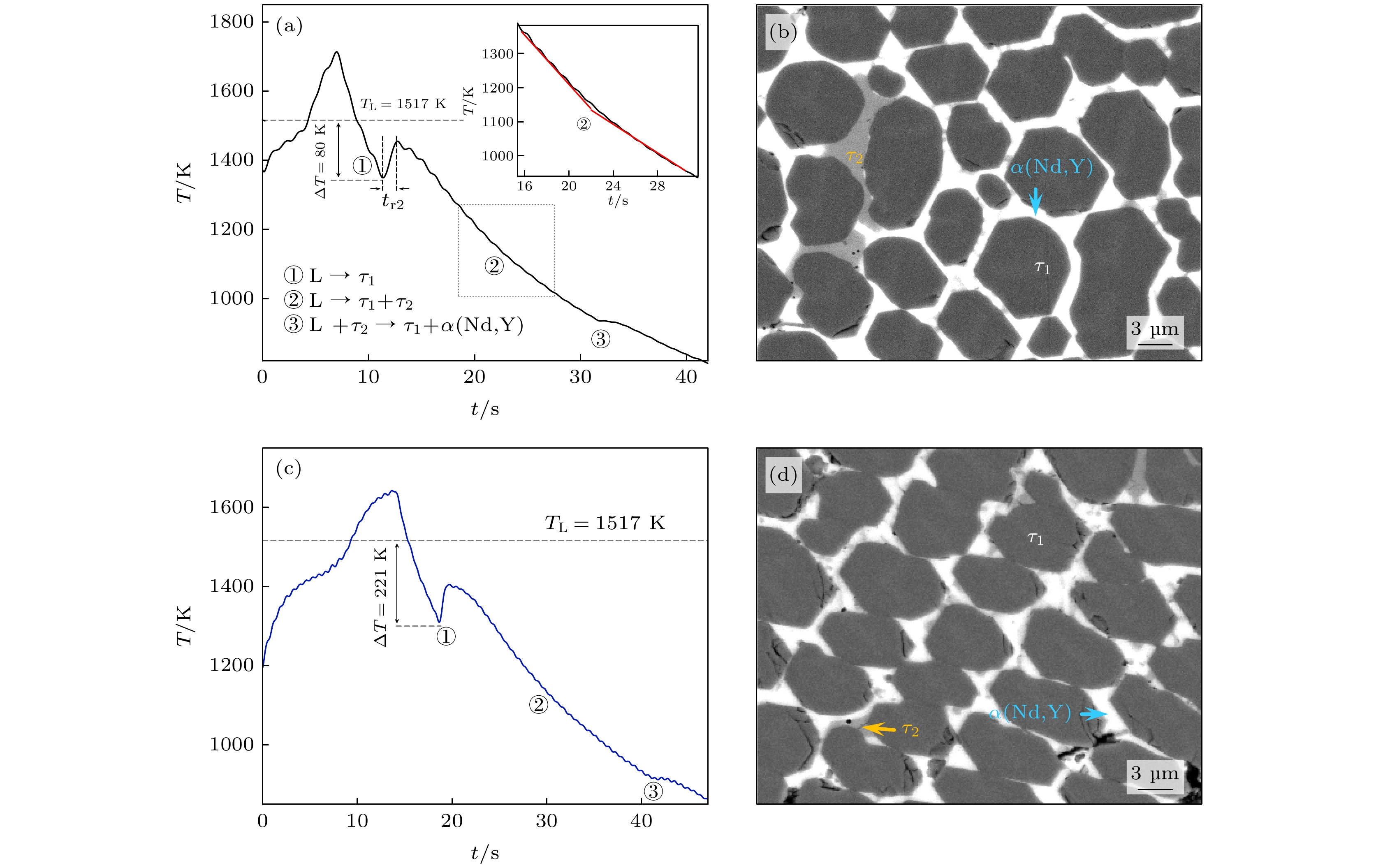 图 5 四元Fe75.6Nd10Y9B5.4合金深过冷快速凝固组织演变规律 (a) ∆T = 180 K冷却曲线; (b) ∆T = 180 K组织形貌; (c) ∆T = 221 K冷却曲线; (d) ∆T = 221 K凝固组织