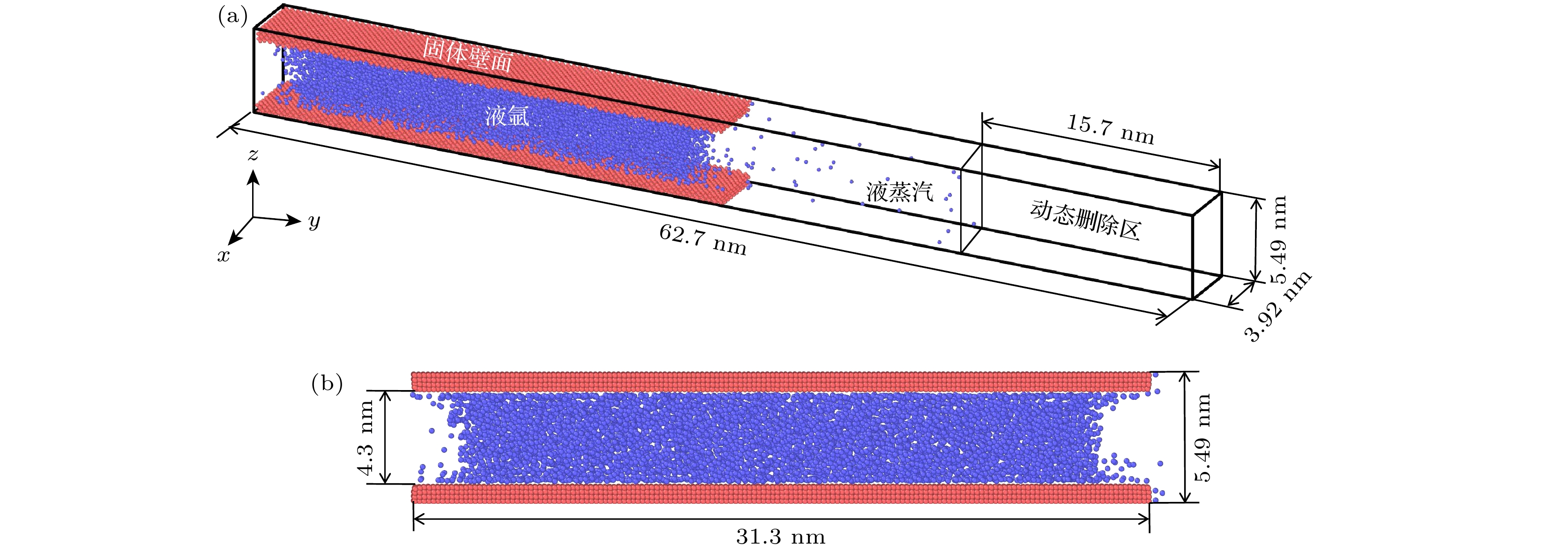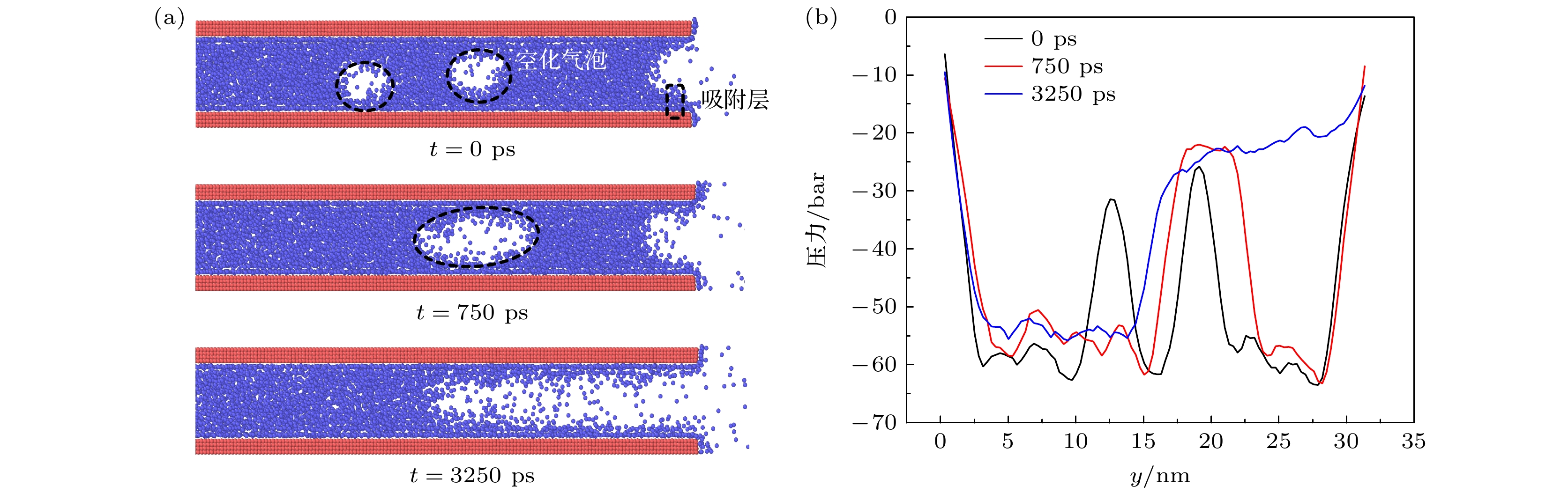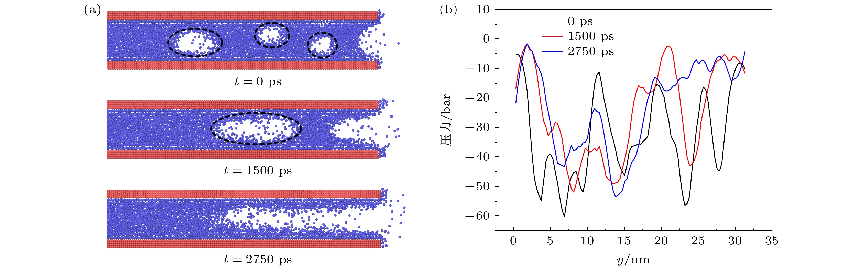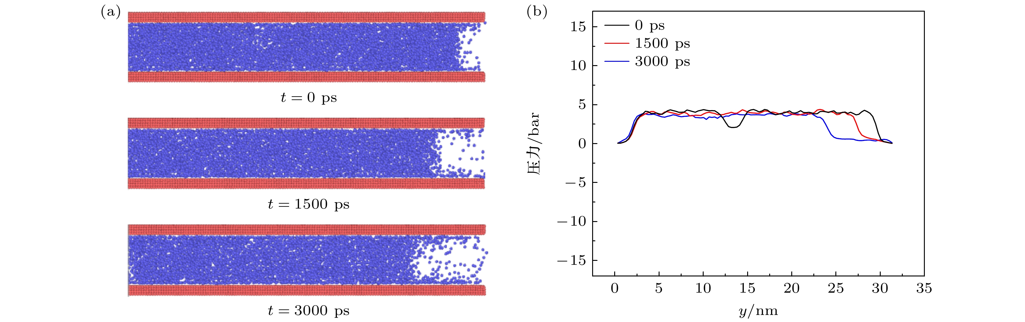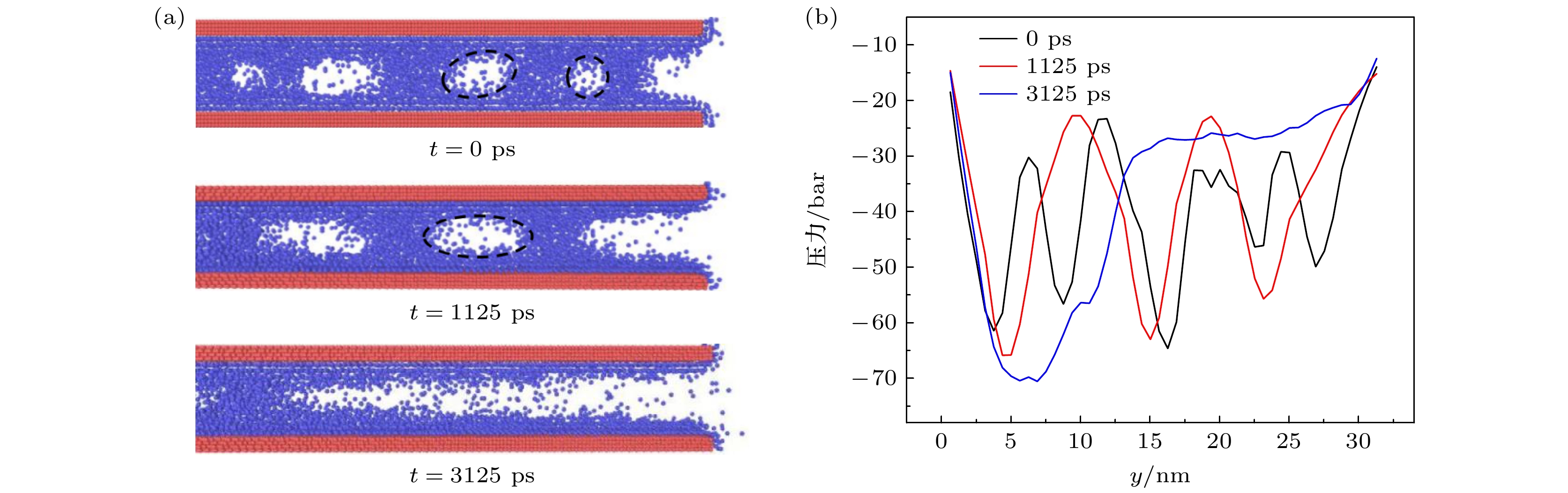 图 8 固-液相互作用强度为$ {\varepsilon }_{\mathrm{s}\mathrm{l}}=0.5{\varepsilon }_{\mathrm{l}\mathrm{l}} $时, 对应时刻(a)通道内液氩的状态, 以及(b)通道内液氩压力沿通道长度方向的分布