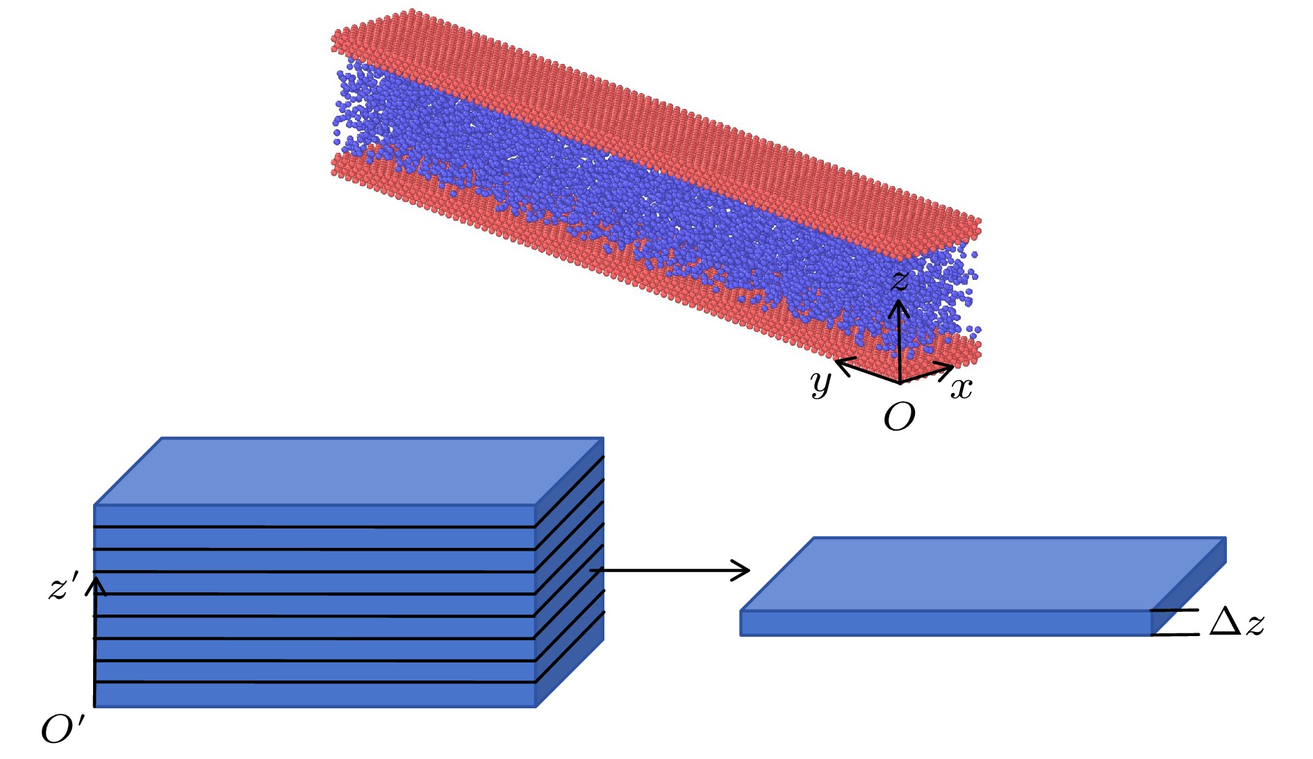 Figure 8. (a) Snapshots of liquid argon configuration within the channel and (b) corresponding pressure profile along the channel’s longitudinal (y) axis under solid-liquid interaction $ {\varepsilon }_{\mathrm{s}\mathrm{l}}=0.5{\varepsilon }_{\mathrm{l}\mathrm{l}} $.
