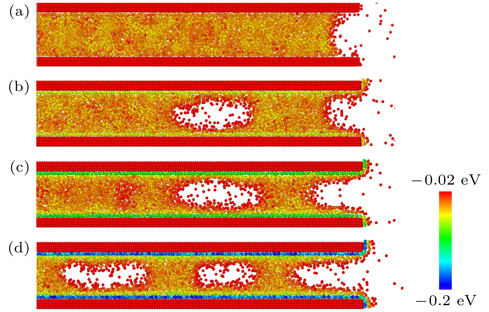 Figure 12. Vapor atoms within cavitation bubbles immediately before collapse under different solid-liquid interaction strengths: (a) $ {\varepsilon }_{\mathrm{s}\mathrm{l}}={\varepsilon }_{\mathrm{l}\mathrm{l}} $; (b) $ {\varepsilon }_{\mathrm{s}\mathrm{l}}={2\varepsilon }_{\mathrm{l}\mathrm{l}} $; (c) $ {\varepsilon }_{\mathrm{s}\mathrm{l}}={4\varepsilon }_{\mathrm{l}\mathrm{l}} $.