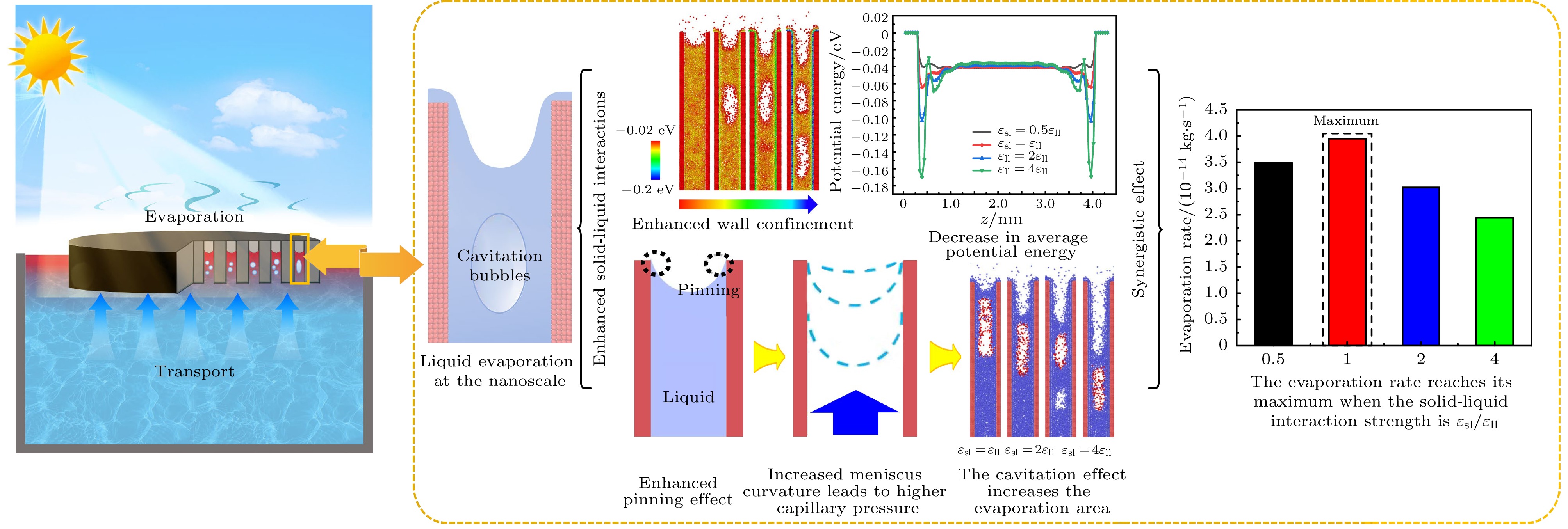 Liquid evaporation on a nanoscale is significantly strengthened by microscopic effects, with its rate even exceeding the predicted upper limit of the classical Hertz-Knudsen equation. This property makes nanoscale liquid evaporation highly valuable for applications in solar-driven interfacial evaporation, electronics cooling, and microfluidics. However, existing research predominantly focuses on the influence of individual microscopic effects, leaving the synergistic mechanisms of multiple effects to be poorly understood. To deeply reveal the microscopic mechanism of liquid phase change on a nanoscale, this study employs liquid argon as a model system to systematically investigate the synergistic effect of potential energy and cavitation on its evaporation. Using molecular dynamics simulations, we study the evaporation process of liquid argon within nanochannels characterized by different solid-liquid interaction strengths under identical temperature and time frame. The results indicate that an increase in the solid-liquid interaction strength reduces the average potential energy of liquid argon and increases the evaporation energy barrier, which theoretically should suppress the evaporation. Nevertheless, the capillary pressure induced by the increased meniscus curvature leads to negative pressure within the liquid argon, triggering a cavitation effect. This cavitation generates bubbles inside the liquid argon, which significantly increases the evaporation surface area and consequently promotes evaporation. Furthermore, the meniscus-dominated evaporation mode is gradually weakened, while the contribution from cavitation bubbles becomes increasingly pronounced. This study demonstrates that the evaporation rates of liquid argon in the four nanochannels with different interaction strengths are 3.49 × 10–14, 3.95 × 10–14, 3.02 × 10–14, and 2.44 × 10–14 kg/s, respectively. Therefore, it can be concluded that the evaporation rate does not vary linearly with the increase of solid-liquid interaction strength. On the contrary, under moderate interaction intensity, the optimal synergistic state between potential energy and the cavitation effect is achieved, thereby obtaining a maximum evaporation rate.