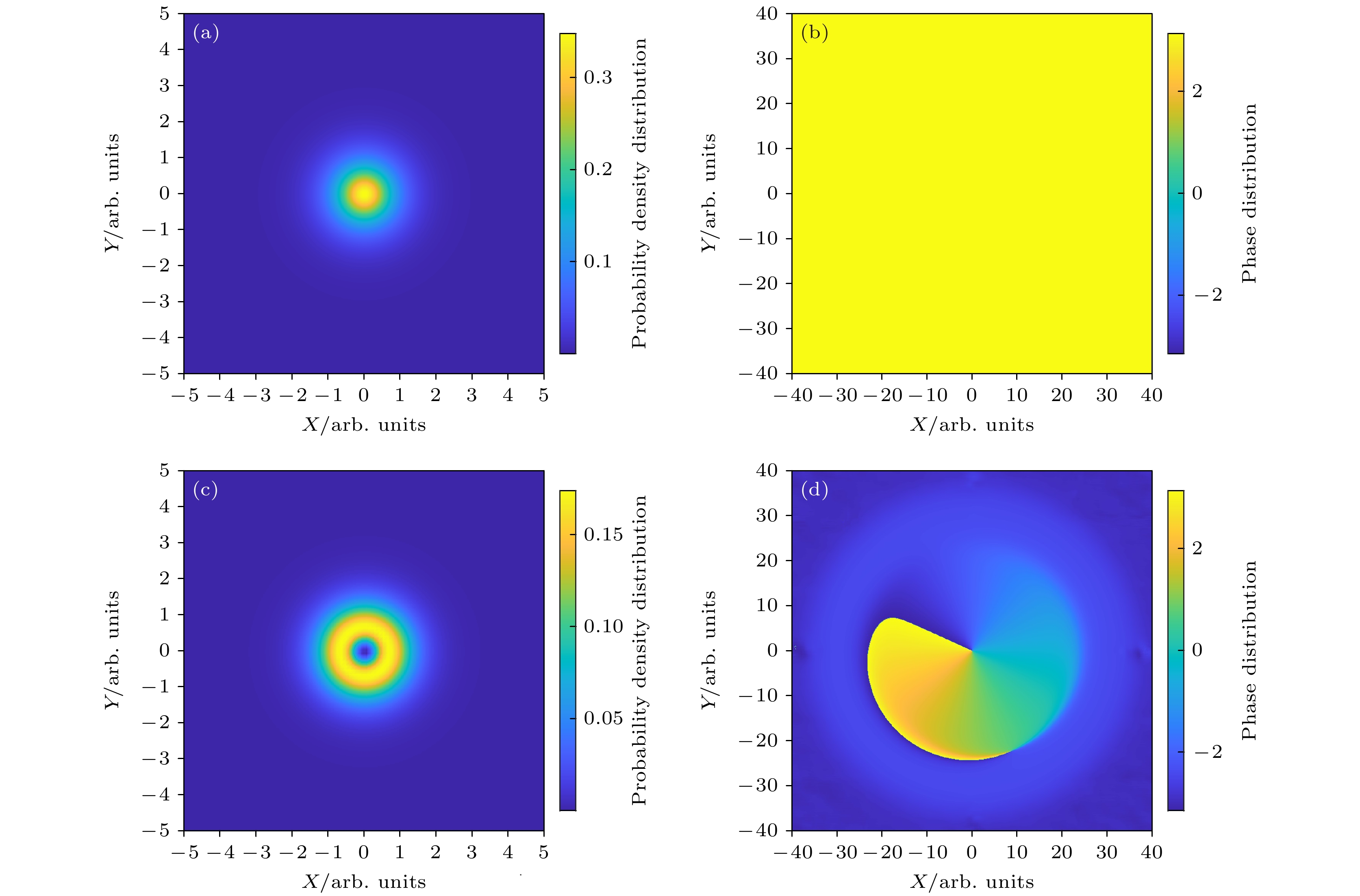 图 1 (a) 1s轨道概率密度空间分布图; (b) 1s轨道相位空间分布图; (c) 2p–轨道概率密度空间分布图; (d) 2p–轨道相位空间分布图