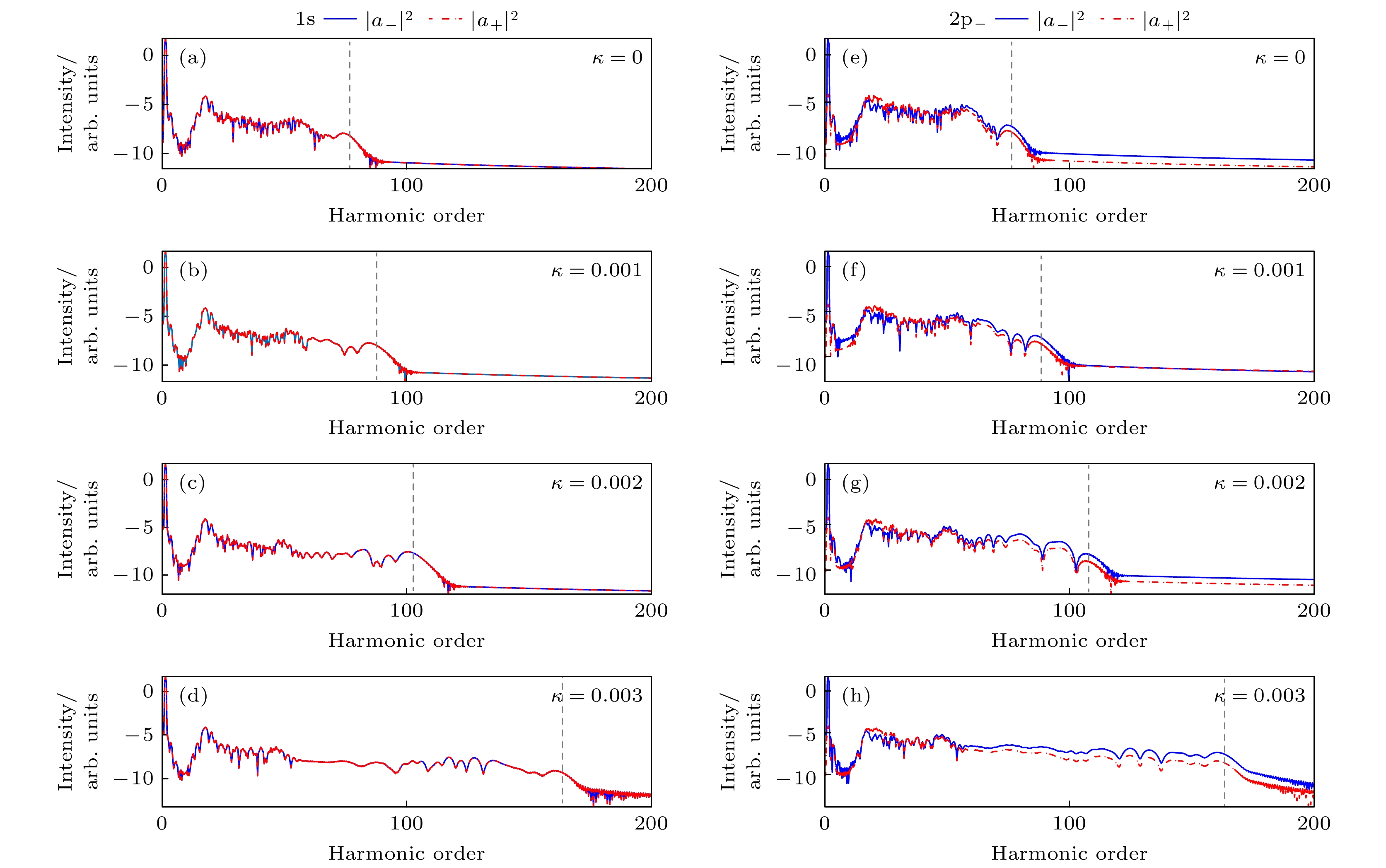 图 2 不同$ \kappa $值驱动场下1s轨道和2p–轨道产生的高次谐波谱 (a) $ \kappa $ = 0, 1s轨道; (b) $ \kappa $ = 0.001, 1s轨道; (c) $ \kappa $ = 0.002, 1s轨道; (d) $ \kappa $ = 0.003, 1s轨道; (e) $ \kappa $ = 0, 2p–轨道; (f) $ \kappa $ = 0.001, 2p–轨道; (g) $ \kappa $ = 0.002, 2p–轨道; (h) $ \kappa $ = 0.003, 2p–轨道 (蓝色实线和红色虚线分别表示高次谐波的右、左旋分量)