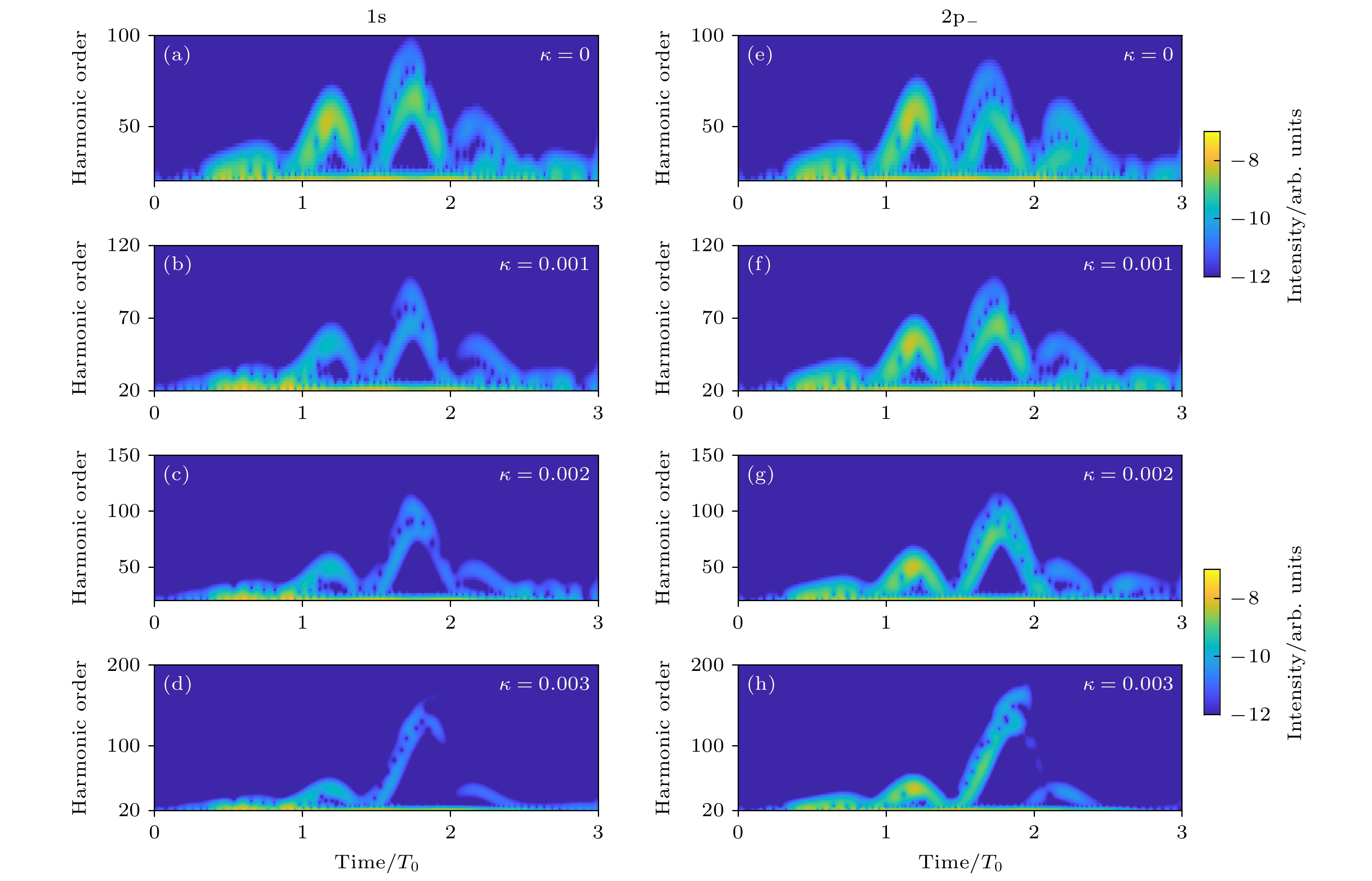 Figure 3. Time-frequency analysis diagram of high-order harmonics: (a) $ \kappa $ = 0, 1s orbital; (b) $ \kappa $ = 0.001, 1s orbital; (c) $ \kappa $ = 0.002, 1s orbital; (d) $ \kappa $ = 0.003, 1s orbital; (e) $ \kappa $ = 0, 2p– orbital; (f) $ \kappa $ = 0.001, 2p– orbital; (g) $ \kappa $ = 0.002, 2p– orbital; (h) $ \kappa $ = 0.003, 2p– orbital.
