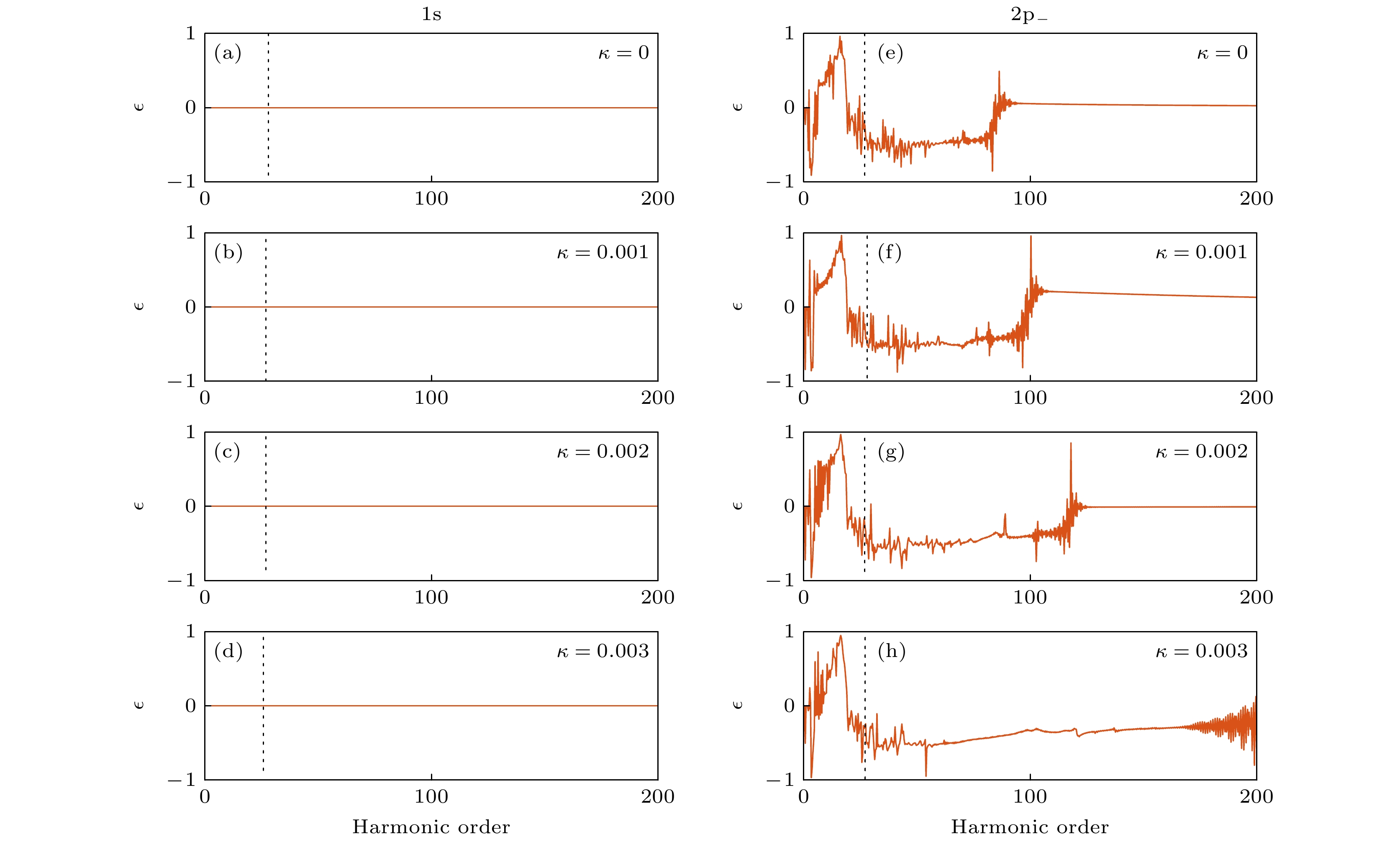 Figure 4. Ellipticity of high harmonics: (a) $ \kappa $ = 0, 1s orbital; (b) $ \kappa $ = 0.001, 1s orbital; (c) $ \kappa $ = 0.002, 1s orbital; (d) $ \kappa $ = 0.003, 1s orbital; (e) $ \kappa $ = 0, 2p– orbital; (f) $ \kappa $ = 0.001, 2p– orbital; (g) $ \kappa $ = 0.002, 2p– orbital; (h) $ \kappa $ = 0.003, 2p– orbital.
