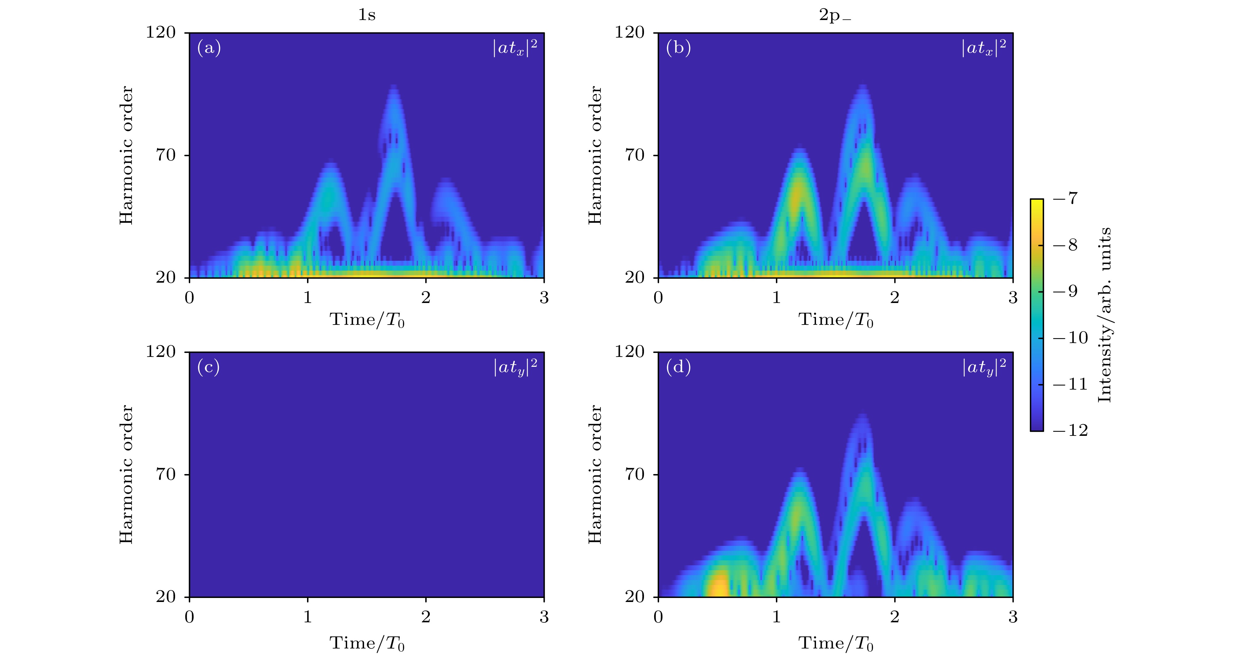 图 5 高次谐波的时频分析图 (a) $ \kappa $ = 0.001, 1s轨道x分量; (b) $ \kappa $ = 0.001, 2p–轨道x分量; (c) $ \kappa $ = 0.001, 1s轨道y分量; (d) $ \kappa $ = 0.001, 2p–轨道y分量