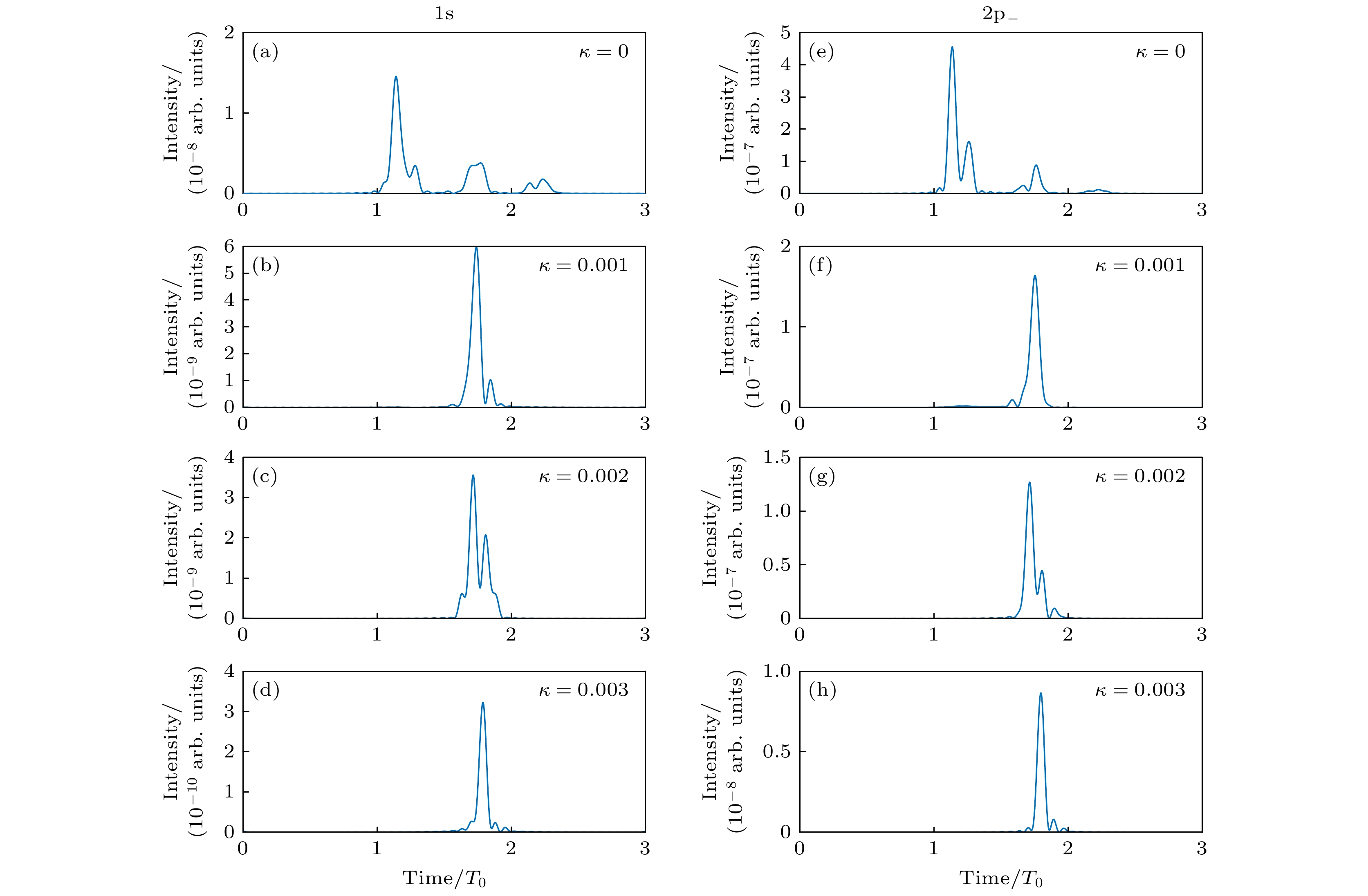 Figure 6. Time-domain envelope of attosecond pulses: (a) $ \kappa $ = 0, 1s orbital; (b) $ \kappa $ = 0.001, 1s orbital; (c) $ \kappa $ = 0.002, 1s orbital; (d) $ \kappa $ = 0.003, 1s orbital; (e) $ \kappa $ = 0, 2p– orbital; (f) $ \kappa $ = 0.001, 2p– orbital; (g) $ \kappa $ = 0.002, 2p– orbital; (h) $ \kappa $ = 0.003, 2p– orbital