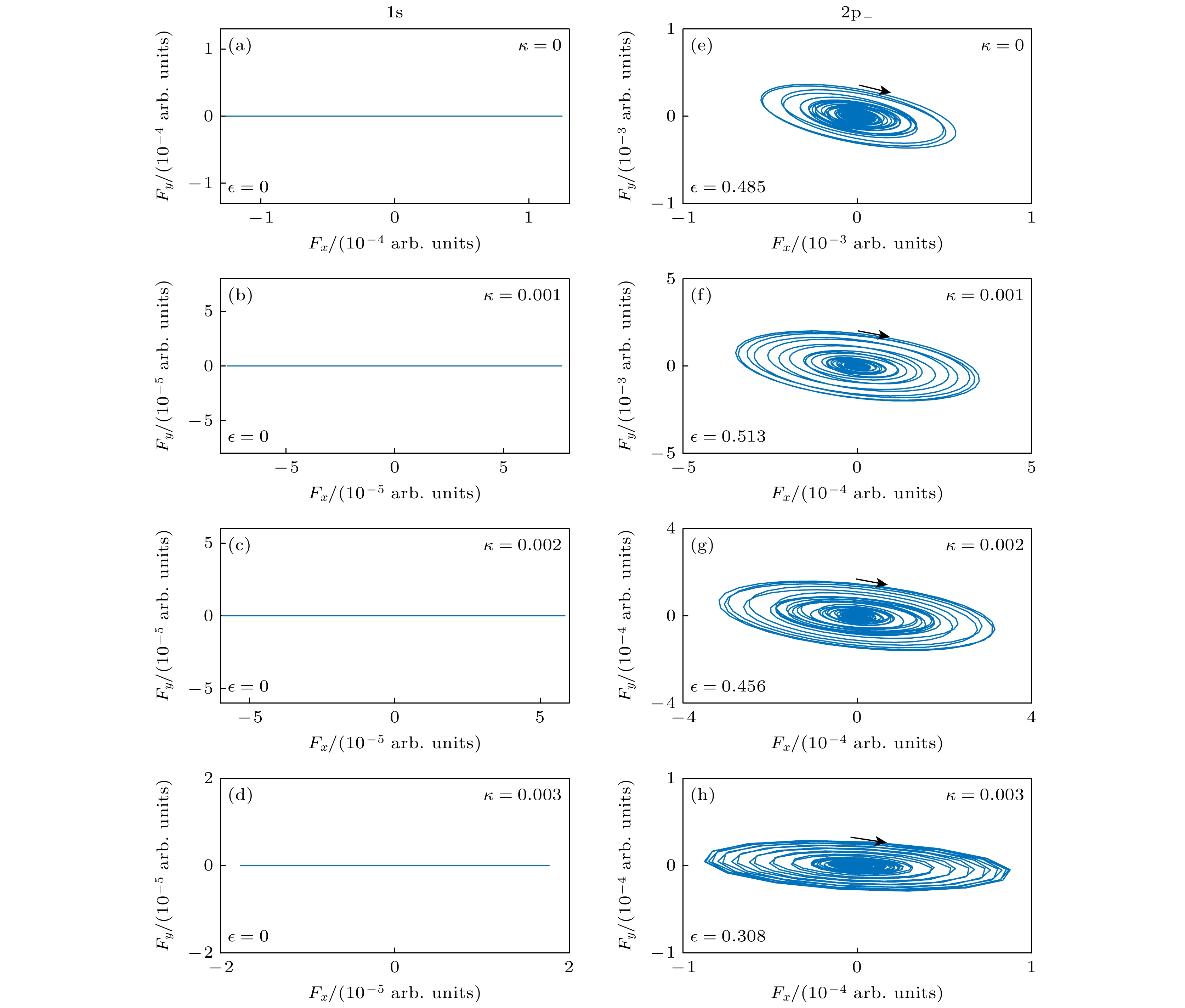 图 4 高次谐波椭偏率 (a) $ \kappa $ = 0, 1s轨道; (b) $ \kappa $ = 0.001, 1s轨道; (c) $ \kappa $ = 0.002, 1s轨道; (d) $ \kappa $ = 0.003, 1s轨道; (e) $ \kappa $ = 0, 2p–轨道; (f) $ \kappa $ = 0.001, 2p–轨道; (g) $ \kappa $ = 0.002, 2p–轨道; (h) $ \kappa $ = 0.003, 2p–轨道
