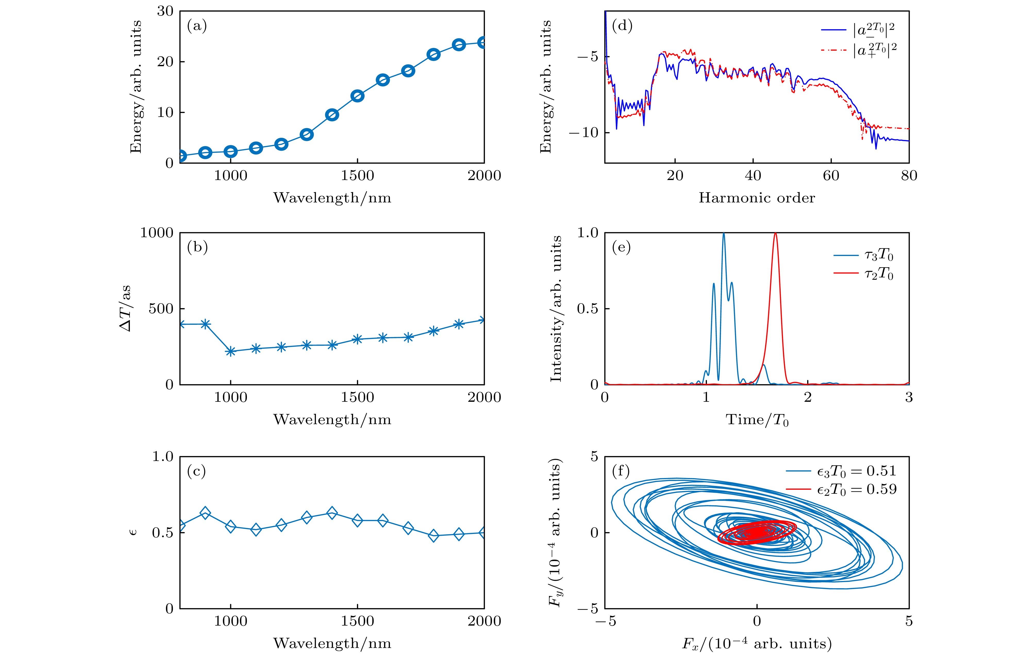 Figure 8. (a)–(c) Cut-off energy of high harmonic spectra of the 2p- orbital, pulse duration and ellipticity versus the wavelength; (d)–(f) the high harmonic spectra, attosecond pulses and time-domain electric field for the driving field with $ {2 T}_{0} $ (The red solid lines represent the results for the driving field with $ {3 T}_{0} $). The attosecond pulses synthesized by the harmonics of 35th–40th. Other parameters are the same as those in Fig. 2(h).